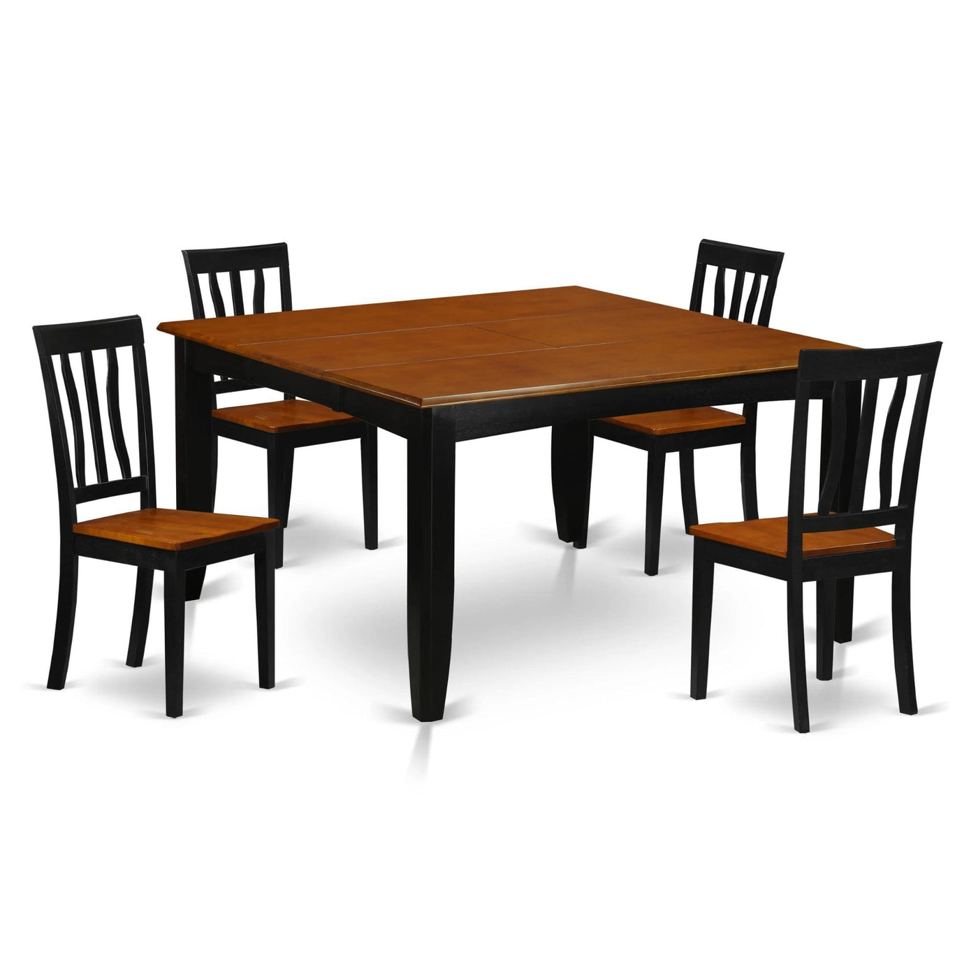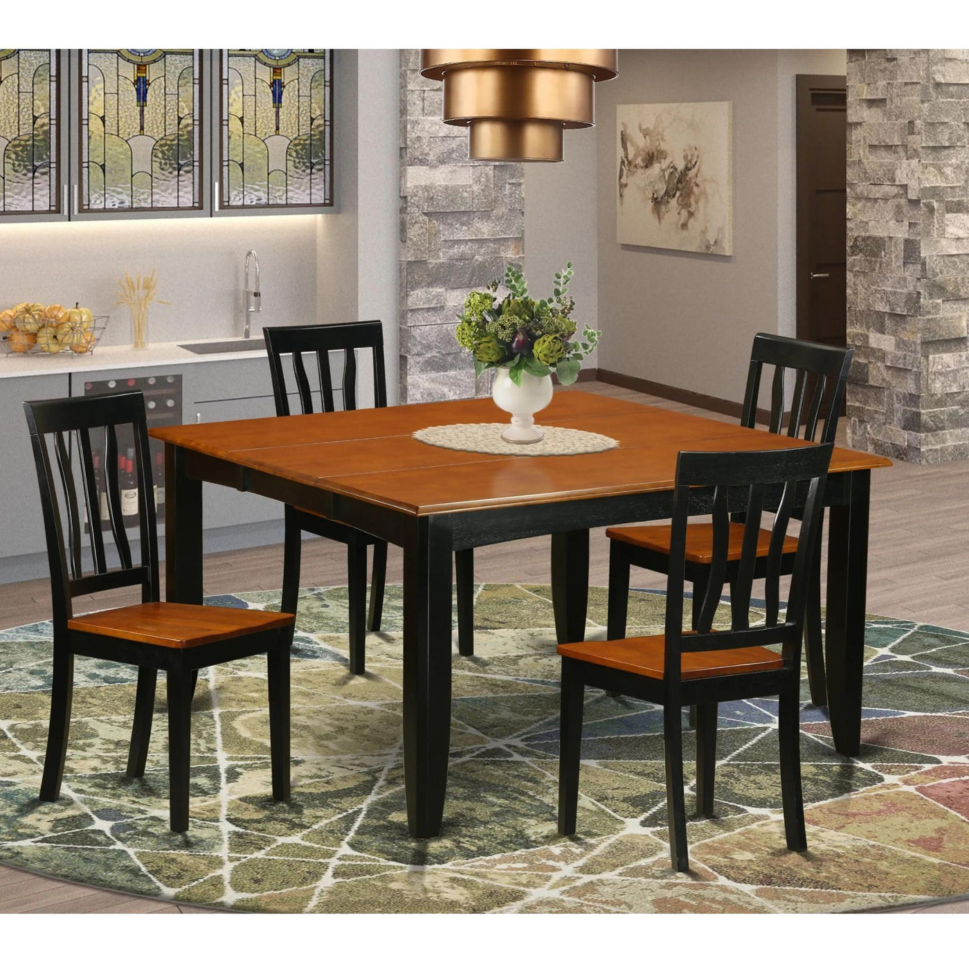 EAST WEST FURNITURE - PFAN5-BCH-W - DINING ROOM SETExperience modern dining with this 5-piece dining room set featuring a butterfly leaf wood table and 4 contemporary dining chairs. The cherry table top seamlessly blends into the sleek Black design, boasting durability and adaptability to complement various home decor styles. The Black-finished wooden legs of the chairs add a touch of modern sophistication, while the table's butterfly leaf top and four legs offer practicality. Crafted from high-grade Asian Wood, renowned for durability and timeless appeal, this dining set showcases meticulous craftsmanship. Expert carpenters have ensured a smooth finish for both chairs and table. Ideal for casual home gatherings or intimate occasions, this dining set offers both innovation and ease of assembly. Trust in our customer-first approach and shop confidently, knowing customer satisfaction is our priority.PRODUCT FEATURES: Frame Material: Asian Wood Frame Color: Black and Cherry Seat Material: Wood Chair Dimensions: Length: 20; Width: 18; Height: 38.5. Table Dimensions: Length: 54/36; Width: 54; Height: 30.Included in the Package: 4 Dinning Room Chairs and a Dining Table.