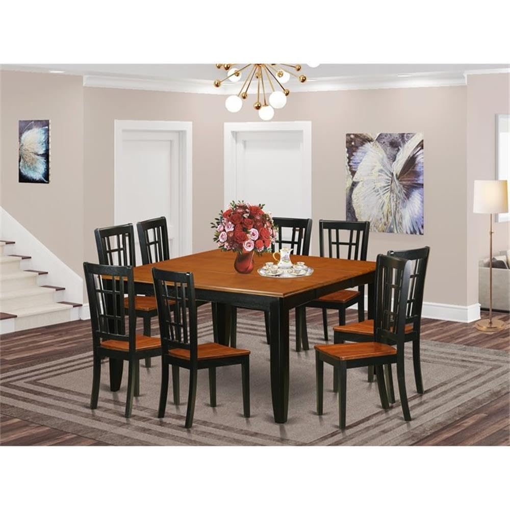 EAST WEST FURNITURE - PFNI9-BCH-W - DINING ROOM SETImmerse yourself in the embodiment of sophistication with our meticulously crafted 9-piece dining set. At its core, a refined rectangular kitchen table takes center stage, boasting a convenient butterfly leaf mechanism for seamless expansion. Accompanying this centerpiece are 8 exquisitely designed kitchen chairs, each a testament to superior craftsmanship. Our collection features a kitchen table set that exudes a refined and sophisticated aesthetic, characterized by an impeccably executed finish. This finish seamlessly extends from the luxurious cherry tabletop to the sleek black surface, creating a seamless and harmonious visual effect. Our meticulously designed dining table set showcases the use of top-tier Asian Rubberwood, a material renowned for its exceptional quality standards. The ingeniously engineered frame, expertly crafted from high-caliber Asian timber, guarantees unparalleled strength and longevity. Introducing our sophisticated kitchen chairs, meticulously designed with wooden seats to exquisitely elevate both the visual allure and ergonomic experience within your culinary space. These chairs boast a generously proportioned seating area, a hallmark of comfort that greatly enhances the overall dining encounterPRODUCT FEATURES: Frame Material: Asian Wood Frame Color: Black and Cherry Table Top Style: Square Chair Back Style: Slatted Seat Material: Wood Chair Dimensions: Length: 20; Width: 17; Height: 39. Table Dimensions: Length: 54/36; Width: 54; Height: 30.Included in the Package: 8 Dinning Room Chairs and a Dining Table.