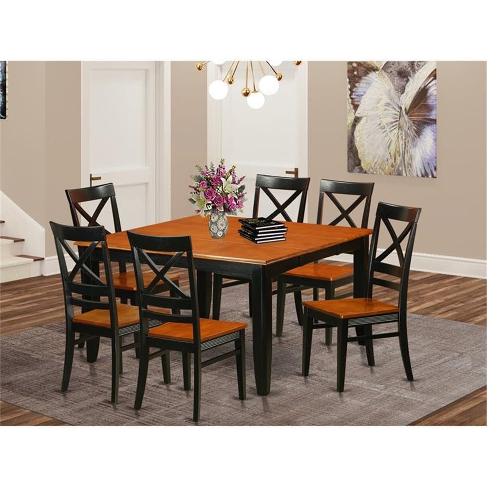 EAST WEST FURNITURE - PFQU7-BCH-W - MODERN DINING TABLE SETPresenting our sophisticated 7-piece dining set, showcasing an innovative kitchen table paired with 6 contemporary chairs. This exquisite dining ensemble enhances the ambiance of any dining area through its refined design and captivating embellishments. This refined dining set features an exquisite kitchen table adorned with a cherry-colored tabletop, elegantly supported by four robust hardwood legs. The accompanying modern chairs are thoughtfully crafted with four sleek black legs and ergonomically designed wooden seats to ensure comfort. Our sophisticated dining room collection is meticulously crafted utilizing premium Asian timber, specifically Rubberwood, renowned for its exceptional quality. The frame of the dining table set is expertly manufactured from high-grade timber, ensuring unparalleled durability and stability. These kitchen chairs feature meticulously crafted wooden seats that enhance the aesthetic appeal of the culinary space. The expansive seating area not only augments visual elegance but also ensures a heightened level of comfort. If you encounter any difficulties while assembling, don't hesitate to reach out to us. Rest assured, our primary focus is customer satisfaction. Purchase our products with confidence, as you can easily put together the modern table with accompanying kitchen chairs by following the provided instructions.PRODUCT FEATURES: Frame Material: Asian Wood Frame Color: Black and Cherry Seat Material: Wood Chair Dimensions: Length: 22; Width: 18; Height: 40. Table Dimensions: Length: 54/36; Width: 54; Height: 30.Included in the Package: 6 Dinning Room Chairs and a Dinner Table.