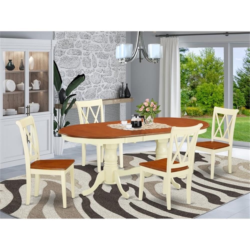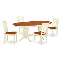 This excellent PLCL5-BMK-W kitchen set features an amazing finish which has a country peaceful experience. The small kitchen table with built-in self-storage butterfly leaf which fits 4 to 8 persons. Dazzling solid wood table top with well-built carved pedestal support. Beveled oval shape to make welcoming kitchen space ambiance and finished in rich Buttermilk and Cherry, the small kitchen table can be acquired with hardwood or padded seat chairs. In-built self-storage butterfly leaf can be folded subtly underneath the tabletop when not being used and provides the greatest in flexibility for individuals who enjoy to set up modest, passionate dinners as well as full-out family affairs. Slender Double X back kitchen chairs finished in Buttermilk and Cherry color with wood seats present fashionable and cozy seating. Made up of hardwood, the chair is stable and offers a sturdy finish. The chairs add elegance and class to any place you have placed them. The frame of the chairs are engineered to offer a great amount of comfort to your spine and thus reduce the chances of back pain. The matching color of the chair with the table brings a good contrast in the kitchen area. Buttermilk and Cherry finish bench matches well with both the table and the chairs. The standard shape, size and design makes the dining area significantly attractive. This contemporary, budget friendly, durable and comfortable dining set can be good choice if you are looking for a great dining time experience with your family or friends.Features:Includes: 1 x oval table, 4 x wooden chair.Material: Asian hardwoodFinish: Buttermilk white and cherry5-piece dining room area table set meant for 4-kitchen area table along with 4 dining room chairs in buttermilk and cherry finish.This amazing dining table has an eighteen inch self-storing butterfly leaf which can be stored right underneath table top.Brand kitchen set which constructed of all Asian hardwood.An absence of MDF, veneer, laminate included in our products.Elegant buttermilk and cherry finish dining set requires a simple assembly.Note: Hardware package and instruction manual is located in/under the seat.Specifications:Table Dimensions: 30"H x 42"W x 78"DDining Chair Dimensions: 38"H x 18"W x 21"DProduct Weight: (Table) 60 lbs; (Chair) 35 lbsChair Weight Capacity: 300