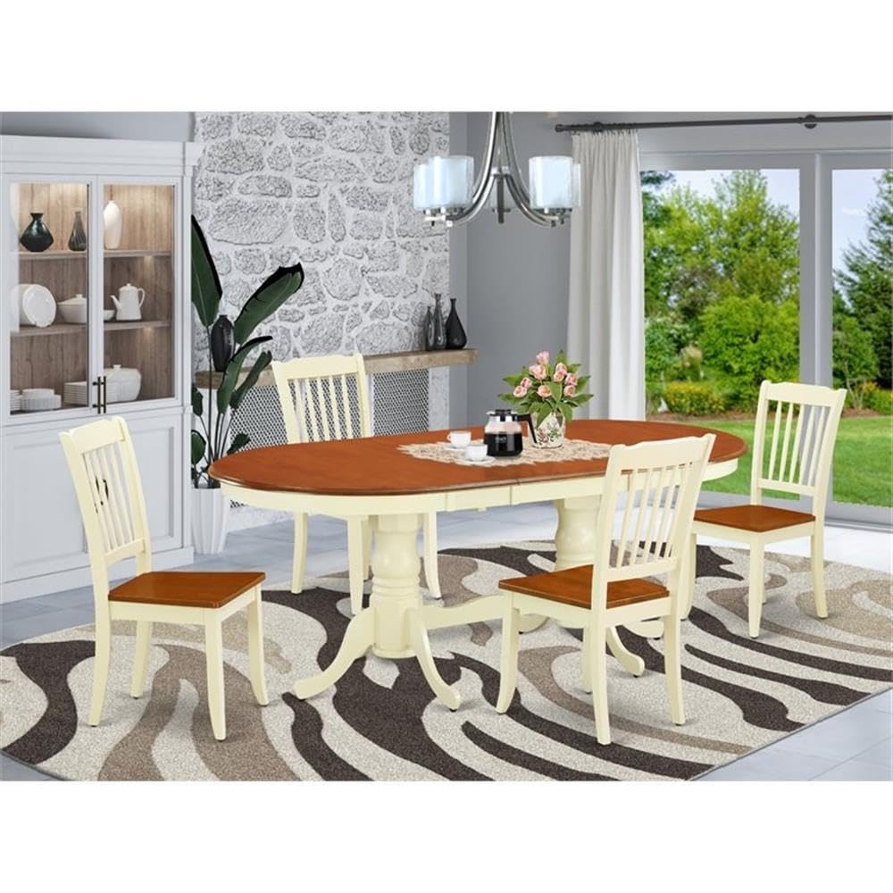 EAST WEST FURNITURE - BOVA5-LWH-W - DINING ROOM SETTreat your room's decor with a new and polished look with this modern dining set. The small kitchen table with a built-in self-storage butterfly leaf which fits 4 to 8 persons. Dazzling solid wood table top with well-built carved pedestal support. Beveled oval shape to make a welcoming kitchen space ambiance and finished in rich Buttermilk and Cherry, the small kitchen table can be acquired with hardwood or padded seat chairs. The in-built self-storage butterfly leaf can be folded subtly underneath the tabletop when not being used and provides the greatest flexibility for individuals who enjoy set up modest, passionate dinners as well as full-out family affairs. The eye-catching Danbury dining room chair finished in elegant Buttermilk and Cherry offers a modern look in your dinette space. These Kitchen dining chairs come with a solid wood seat to fit personal preferences and perfect design. The Stylish dining chair features curved front legs. The 7 vertical slats give any dining area a touch of class and sophistication. Made up of hardwood, the chair is stable and offers a sturdy finish. The chairs add elegance and class to any place you have placed them. The frame of the chairs is engineered to offer a great amount of comfort to your spine and thus reduce the chances of back pain. The matching color of the chair with the table brings a good contrast to the kitchen area. The standard shape, size and design make the dining area significantly attractive. This contemporary, budget friendly, durable and comfortable dining set can be a good choice if you are looking for a great dining time experience with your family or friends.PRODUCT FEATURE: Material: Asian Wood Table Color: Buttermilk and Cherry Chair Color: Buttermilk and Cherry Chairs Back Style: Slatted Table dimensions: Length 60/78; Width 42; Height 30. Chair dimensions: Length 22; Width 18; Height 38. Weight Capacity: 300 lbsIncluded in package: 4 Kitchen Chair and a Modern Dining Table
