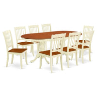EAST WEST FURNITURE - PLDA9-BMK-W- DINING ROOM SETTreat your room's decor with a new and polished look with this modern dining set. The small kitchen table with built-in self-storage butterfly leaf fits 4 to 8 persons. Dazzling solid wood table top with well-built carved pedestal support. Beveled oval shape to make a welcoming kitchen space ambiance and finished in rich Buttermilk and Cherry, the small kitchen table can be acquired with hardwood or padded seat chairs. The in-built self-storage butterfly leaf can be folded subtly underneath the tabletop when not being used and provides the greatest flexibility for individuals who enjoy to set up modest, passionate dinners as well as full-out family affairs. The eye-catching Danbury dining room chair finished in elegant Buttermilk and Cherry offers a modern look in your dinette space. These Kitchen dining chairs come with a solid wood seat to fit personal preferences and perfect design. The Stylish dining chair features curved front legs. The 7 vertical slats give any dining area a touch of class and sophistication. Made up of hardwood, the chair is stable and offers a sturdy finish. The chairs add elegance and class to any place you have placed them. The frame of the chairs is engineered to offer a great amount of comfort to your spine and thus reduce the chances of back pain. The matching color of the chair with the table brings a good contrast to the kitchen area. The standard shape, size and design make the dining area significantly attractive. This contemporary, budget friendly, durable and comfortable dining set can be a good choice if you are looking for a great dining time experience with your family or friends.PRODUCT FEATURE: Material: Asian Hardwood Table Color: Buttermilk and Cherry Chair Color: Buttermilk and Cherry Seat material: Wood Table Dimensions: Length 60/78; Width 42; Height 30. Chair Dimensions: Length 22; Width 18; Height 38. Weight Capacity: 300 lbsIncluded in package: 8 Kitchen Chair and a Modern Dining Table