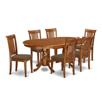 EAST WEST FURNITURE - PLPO7-SBR-C - kitchen SETIntroducing our 7-piece dining room table set featuring an oval wood table with an elegant Saddle Brown top and pedestal legs, accompanied by 6 modern dining chairs with matching wooden frames. The chairs offer a comfortable Linen Fabric seat and Slatted Back, while the table's butterfly leaf oval top and double pedestal legs add a contemporary touch. Crafted from high-quality Asian rubber wood, each element of this dining ensemble is meticulously designed, including anti-slip protectors to safeguard your floors. Our experienced carpenters ensure a smooth finish, combining expertise and innovation. With a timeless design, this set effortlessly complements any room decor, infusing sophistication into your home. Ideal for casual gatherings or intimate parties, it's both innovative and easy to assemble. Your satisfaction is our priority, so purchase with confidence. For any assembly assistance, our customer support is available.PRODUCT FEATURES: Frame Material: Asian Wood Frame Color: Saddle Brown Table Top Style: Oval Chair Back Style: Slatted Seat Material: Linen Fabric Chair Dimensions: Length: 22; Width: 17; Height: 38. Table Dimensions: Length: 78/60; Width: 42; Height: 30.Included in the Package: 6 Modern Dining Chairs and a Modern Table.