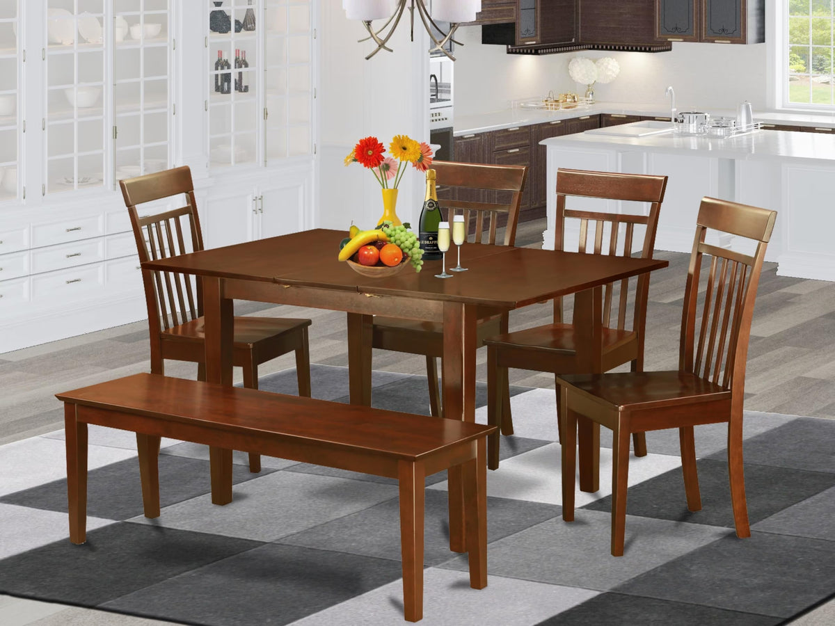 EAST WEST FURNITURE - PSCA6C-MAH-W - 6-Pc KITCHEN DINING ROOM SETOur meticulously crafted 6-piece dining table set includes a finely constructed wooden dining table, accompanied by 4 sophisticated dining chairs and a sleek dining bench. The modern aesthetic embodied by the dining chairs not only introduces an element of refinement to any dining area but also enhances its overall visual appeal. Our exquisite dining table set showcases an impeccable Mahogany finish that extends seamlessly from the tabletop to the meticulously crafted wooden legs. This versatile design transcends fleeting trends and effortlessly complements a diverse range of interior decor styles, ensuring its enduring allure in your home for many years to come. This exquisite kitchen set has been meticulously crafted from premium Rubberwood, a distinguished Asian timber. The incorporation of anti-slip protectors on each leg underscores our unwavering commitment to preserving the integrity of your flooring. The elevated backrest harmoniously complements the natural curvature of the spine, thereby facilitating a consistently ergonomic seated posture. Furthermore, the generously proportioned seats enhance the overall comfort quotient.PRODUCT FEATURES: Frame Material: Asian Solid Wood Mid Century Chair Seating Material: Wood dining room chairs Color: Mahogany Dining Table Color: Mahogany dining room chairs Dimensions: Length: 20; Width: 17; Height: 38. dining room chairs Dimensions: Length: 51; Width: 15; Height: 18. Modern dining room table Dimensions: Length: 60/48; Width: 32; Height: 30.Include in the Package: 6-Pc Dining Room Table Set 4 Modern Dining Chairs, A Modern Dining Bench and 1 Dining Table.