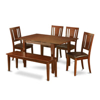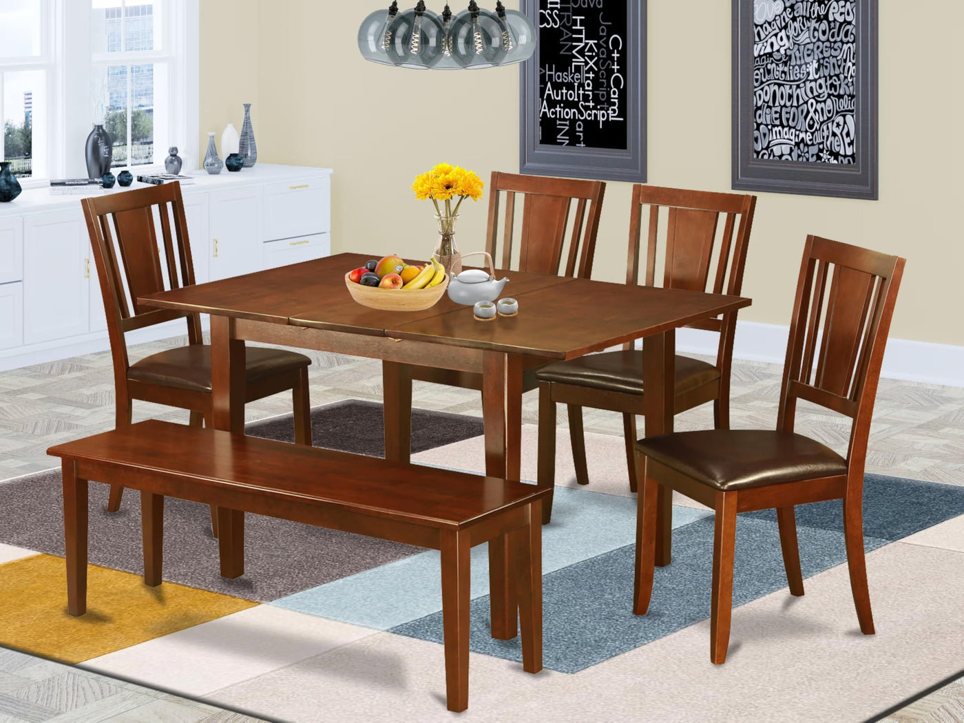 EAST WEST FURNITURE - PSDU6D-MAH-LC - 6-PIECE DINING SETThis meticulously designed 6-piece dining set encompasses a finely crafted rectangular dining table, a complementary dining bench, and 4 exquisitely designed kitchen chairs. Elevating the ambiance of your dining room or kitchen this ensemble showcases a 12-inch self-storage butterfly leaf, seamlessly incorporating a sense of sophistication into the overall design. Our pedestal table stands out with its sophisticated Mahogany finish, impeccably paired with dining room chairs of unparalleled quality. These chairs feature luxurious Faux Leather seating and robust chair legs skillfully crafted from solid Mahogany wood. The meticulous application of a premium finish to the entire dining room set results in a truly exquisite aesthetic enhancement, making it the perfect addition to elevate the ambiance of any dining area. The kitchen table ensemble is meticulously crafted from the finest-grade Asian timber, specifically identified as Rubberwood, esteemed for its superior characteristics. Each table leg is thoughtfully furnished with anti-slip protectors, serving to preempt any potential flooring damage. The seating of these Parson chairs showcases a premium Faux Leather construction, which significantly enhances the overall sitting experience.PRODUCT FEATURES: Seat Material: Faux Leather Chair Legs Color: Mahogany Wooden Dining Table Color: Mahogany Chair Back Style: Slatted Back Dimension of Table: Length: 60/48; Width: 32; Height: 30. Chair Dimension: Length: 21; Width: 17; Height: 38. Dining Bench Dimension: Length: 51; Width: 15; Height: 17.Include in this Dining Room Set - 4 Mid Century Chair, ADining Bench and 1 Modern Dining Room Table.