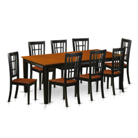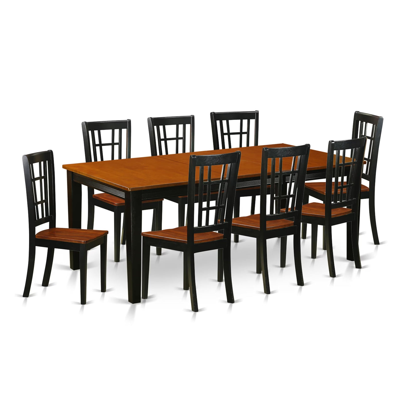 EAST WEST FURNITURE - QUNI9-BCH-W - KITCHEN TABLE SETExperience the elegance of our 9-piece kitchen set, featuring 8 stylish dining chairs and a butterfly leaf kitchen table. The table boasts a Cherry-colored rectangular top, supported by Black hardwood legs, perfectly complementing the Black 4-legged dining room chairs. With a timeless design that seamlessly fits any decor, these modern chairs offer a Wooden Seat and Slatted Back, while the table features a butterfly leaf top and 4 legs. Crafted from durable Asian wood, known as rubber wood, this dining set promises both quality and longevity. Expert carpenters have meticulously designed the chairs and table, resulting in a polished and upscale appearance. Whether for casual home gatherings or intimate occasions, this high-quality dining set is the ideal choice. Assembly is a breeze with the self-storing butterfly leaf table and wooden chairs, and our provided instructions ensure a hassle-free process. Rest assured, customer happiness is our top priority, making your purchase a confident one.PRODUCT FEATURES: Frame Material: Asian Wood Frame Color: Black and Cherry Table Top Style: Rectangular Chair Back Style: Slatted Seat Material: Wood Chair Dimensions: Length: 20; Width: 17; Height: 39. Table Dimensions: Length: 78/60; Width: 40; Height: 30.Included in the Package: 8 Modern Dining Chairs and a Rectangular Table.