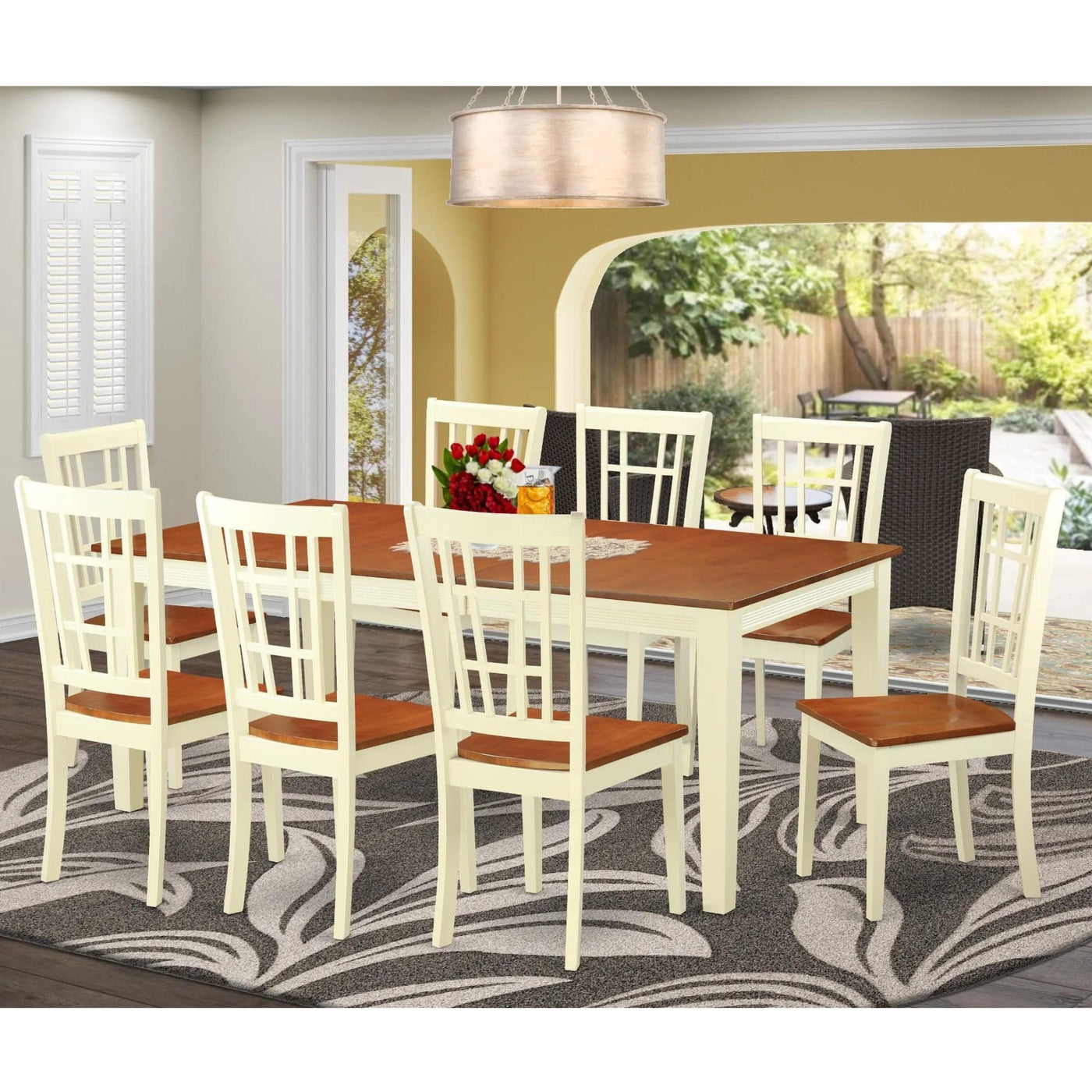 EAST WEST FURNITURE - QUNI9-WHI-W - KITCHEN TABLE SETPresenting a 9-piece mid-century dining set featuring 8 dining room chairs and a butterfly leaf dining table. The wooden table boasts an unchanging Cherry tabletop and enduring Buttermilk finish, its timeless elegance complementing diverse home decors. Dining chairs with Buttermilk-finished wooden legs offer modern sophistication. The chairs have a Wooden Seat and Slatted Back, while the table features a butterfly leaf top and four legs. Crafted from top-quality Asian rubber wood, the set ensures unmatched durability and avoids inferior materials. With versatile style, it's designed to complement your decor for years. Expert carpenters have created a smooth finish, ensuring easy assembly of the self-storing butterfly leaf table and chairs. Suitable for casual home parties or intimate gatherings, this high-quality dining set prioritizes customer satisfaction.PRODUCT FEATURES: Frame Material: Asian Wood Frame Color: Buttermilk and Cherry Table Top Style: Rectangular Chair Back Style: Slatted Seat Material: Wood Chair Dimensions: Length: 20; Width: 17; Height: 39. Table Dimensions: Length: 78/60; Width: 40; Height: 30.Included in the Package: 8 Dinning Room Chairs and a Wood Table.