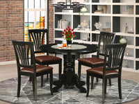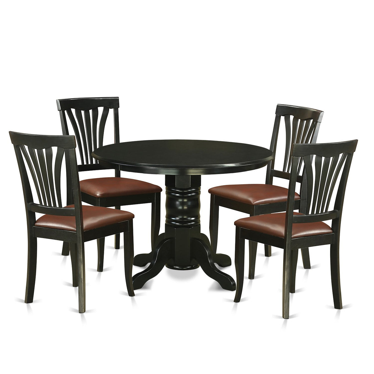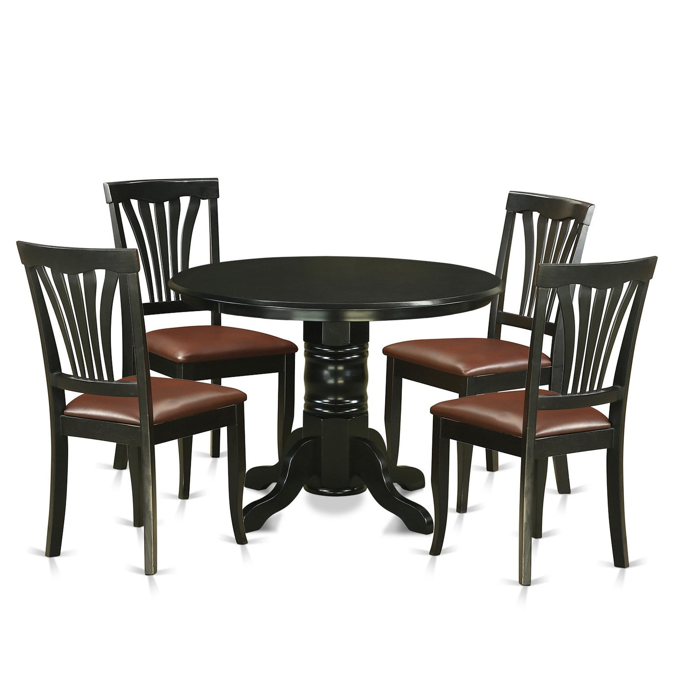 EAST WEST FURNITURE - SHAV5-BLK-LC - DINNER TABLE SETOur impeccably designed 5-piece wooden dining set is highlighted by a meticulously crafted round pedestal dining table and 4 tastefully appointed kitchen chairs. This ensemble collectively imparts an aura of classic sophistication to any living space. The intrinsic versatility of these furnishings is underscored by their enduring design, seamlessly harmonizing with a vast array of pre-existing interior decor arrangements. The dining table showcases a refined design, featuring an elegant Black tabletop and a coordinating Black base finish. The dining experience is elevated through the inclusion of exquisite dining room chairs, characterized by their Faux Leather seats and meticulously crafted Black solid wood chair legs. The intricately crafted dining table set is skillfully fashioned using exquisite Asian hardwood, renowned for its exceptional stability and enduring resilience, guaranteeing years of reliable service. The incorporation of high-density foam in the seat and back design ensures unparalleled comfort, even during extended seating sessions, effectively alleviating any potential sense of fatigue. The wooden chairs are furnished with Faux Leather seats, augmenting the sophistication of the kitchen space. Moreover, the generously proportioned seats prioritize comfort, offering a refined and elevated seating experience.PRODUCT FEATURES: Frame Material: Asian Wood Frame Color: Black Table Top Style: Round Chair Back Style: Slatted Seat Material: Faux Leather Chair Dimensions: Length: 22; Width: 18; Height: 36. Table Dimensions: Length: 42; Width: 42; Height: 30.Included in the Package: 4 Modern Dining Chairs and a Modern Table.