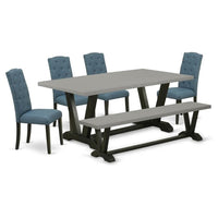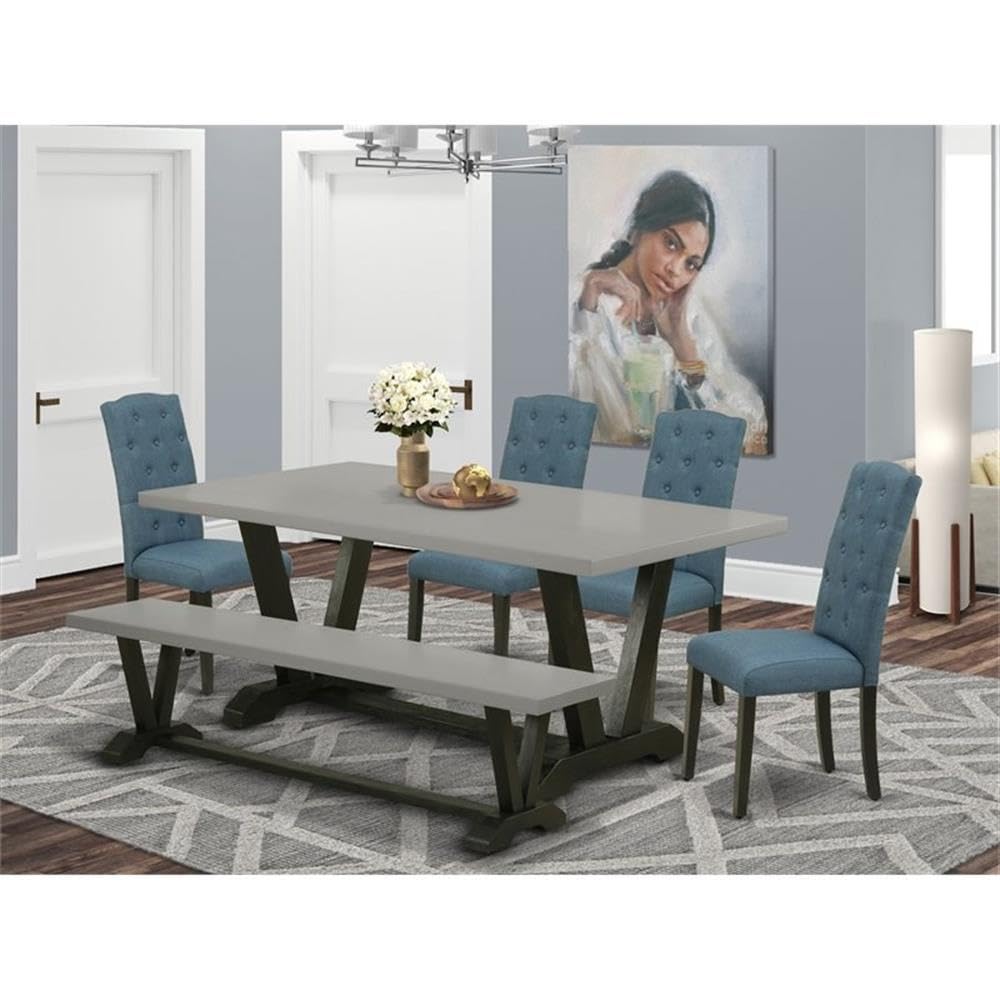 EAST WEST FURNITURE - V697CE121-6 - 6 PIECE KITCHEN TABLE SETOur mid century dining set adds a touch of elegance to any dining room that you and your family will absolutely enjoy. The elegant 6 Piece kitchen dining table set contains a mid century dining table and a wood bench, 4 upholstered dining chairs. This rectangular kitchen table top is offered in a Cement finish. In addition, the dining chairs in a Blue Linen Fabric enhance the elegance of any home. Ideal for dinette, kitchen and dining areas, this multi-functional mid century dining set seats up to 6 people, perfect for families to enjoy mealtimes together. A great addition to your dining area and a perfect ensemble that will strike your guests with its best impression. We have created these Blue finish dining chairs and mid century modern dining table with the help of highly experienced carpenters, who generate a smooth and high-end finish to this modern dining table set. Modern dining chairs of the dining room table set can be moved under the wood table when you finish your meal, which our kitchen table set largely helps you save room space. Designed with easy and fast assembly in mind, each set comes conveniently flat packed with easy-to-follow instructions and all necessary tools included. Our superior quality kitchen dining table set is perfect for you and your dining area as well as the kitchen area. Our dining table set is quite simple to clean and always offers a good appeal. The modern dining set adds a refined touch to even your most casual family dinners. Keep Enjoy With East West Furniture!DINETTE SET FEATURES:? Wood Material: Rubberwood? Fabric Material: Linen Fabric? Modern Dining Table Top Color: Cement? Modern Table Legs Color: Wire Brushed Black? Parson Chairs Fabric Color: Blue? Dining Chairs Legs Color: Black? Parsons Chairs Back Style: Button Tufted? Table Dimensions: Length: 72; Width: 40; Height: 30.? Chair Dimensions: Length