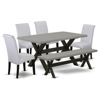 East West Furniture - X696BA105-6 - 6-Piece Dining Room Set: Our dinette set adds a touch of elegance to any dining room that you and your family will absolutely enjoy. The elegant 6 Piece dining room set includes a wood kitchen table and a mid century modern bench, 4 kitchen chairs. This rectangular table top is offered in a Cement finish. In addition, the upholstered dining chairs in a Grey Linen Fabric enhance the elegance of any home. Ideal for dinette, kitchen and dining areas, this multi-functional dinette set seats up to 6 people, perfect for families to enjoy mealtimes together. A great addition to your dining area and a perfect ensemble that will strike your guests with its best impression. We have created these Grey finish upholstered dining chairs and dining room table with the help of highly experienced carpenters, who generate a smooth and high-end finish to this dining room set. The modern chairs of the dinette set can be moved under the mid century dining table when you finish your meal, which our dining room table set largely helps you save room space. Designed with easy and fast assembly in mind, each set comes conveniently flat packed with easy-to-follow instructions and all necessary tools included. Our high quality dinner table set is perfect for you and your dining area as well as the kitchen area. Our dinette set is quite simple to clean and always offers a great appeal. The dining table set adds a refined touch to even your most casual family dinners. Keep Enjoy With East West Furniture!Features:Includes: A mid-century dining table and a dining room bench, 4 upholstered dining chairs.Material: Rubberwood, linen fabricFinish: Gray, cement, black6-piece dinette set: Our mid-century dining set consists of a modern table and a wood bench, 4 matching parson dining chairs.Bring modern and elegant style to any dining area with our kitchen dining table set.This beautiful table set is a shining example of modern design and forward thinking.A dining set is a perfect thing to upgrade your kitchen or dining room style.Mid century modern dining set finish: We have designed a dinette set with a top quality finish that produces a stunning appearance to any dining area.Our kitchen table has a cement finish rectangular table top and wire brushed black wooden x-style legs.The upholstered dining chairs have included a grey linen fabric seat and black finish wooden 4 legs.Our wooden table and dining chairs finish combination is matched with any room decor.Solid wood structure: This dining room set is made from superior quality Asian wood material known as rubberwood.Our dining room set durability is unmatched thanks to this good quality material that is used during manufacturing.No heat-treated wood, plywood, veneer or laminated wood has been used to construct this modern dining set.Its versatile style will complement just about any decor in your home for many years to come.Parsons chairs material: These parsons chairs provide an attractive touch to your dining area with linen fabric seat and high chair back.The seat and backrest of the upholstered chairs are made of superior quality linen fabric.The linen fabric parson chairs will provide a touch of beauty to any home with a contemporary appearance.Our soft cushion and backrest make these upholstered chairs a pleasant sitting feeling.Parson chairs back style: High back.Specifications:Table Dimensions: 30"H x 36"W x 60"DDining Chair Dimensions: 42"H x 19"W x 26"DBench Dimensions: 18"H x 60"W x 15"DProduct Weight: (Table) 87 lbs; (Chair) 38 lbs; (Bench) 19 lbsChair Weight Capacity: 300 lbsWeight Capacity: (Bench) 400-500 lbs
