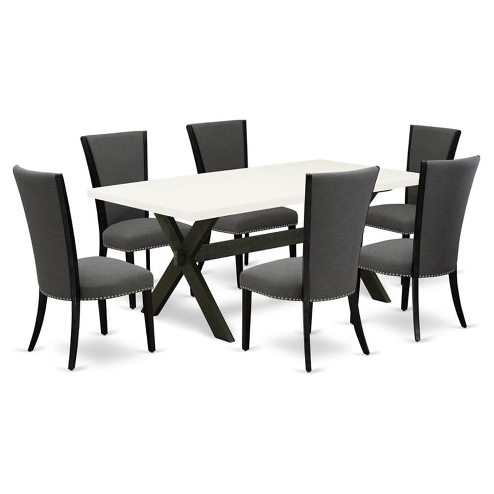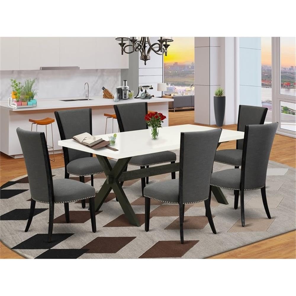 East West Furniture X627VE650-7 7 Pc Modern Dining Set Consists of a Linen White Wooden Dining Table and 6 Dark Gotham Grey Linen Fabric Upholstered Chairs with High Back - Wire Brushed Black Finish