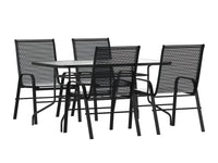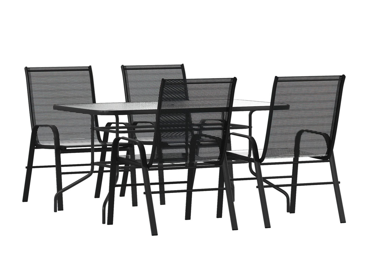 Have the beautiful patio or deck setting you've always wanted at your home or business with this modern outdoor patio dining set for 4. The sizable rectangular outdoor glass table has a designer rippled look, but is smooth to the touch to keep items level. The black metal base and frame provide a striking contrast to the glass top for an on-trend look. The overall design is enhanced by the ergonomic sling patio chairs that have breathable, black flex comfort material to keep you cool during the hot summer days and curved arms to relieve pressure from the upper body.Serve meals outside for a change of pace with no worries. This outdoor patio table boasts a solid steel, powder coated frame that will hold up to 130 Lbs. weight capacity and the outdoor patio chairs will hold up to 350 pounds to accommodate most users. The weather-resistant frames are designed to be enjoyed no matter the season. For longevity, care should be taken to protect from long periods of wet weather.Lightweight and stackable, the commercial grade patio chairs can be stacked up to 4 chairs high to store or clean your outdoor dining space. With plenty of space on this glass top patio table for everyone to have elbow room you'll get to take advantage of the outdoors more often while you enjoy time with friends and family.