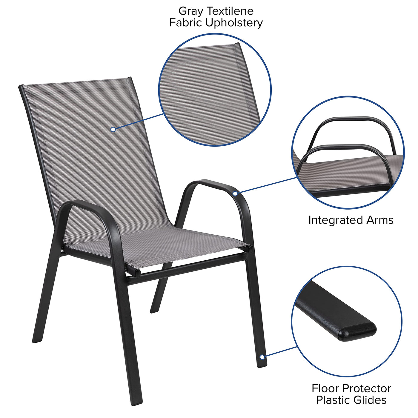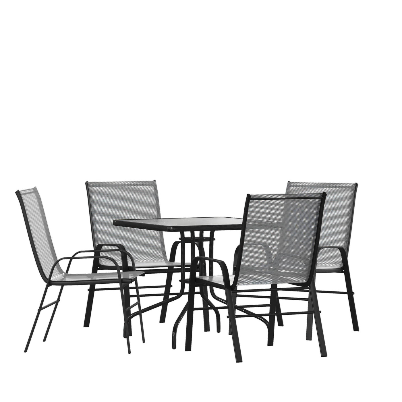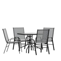 Entertaining outdoors can be relaxed or elegant depending on your occasion so don't put off furnishing the outdoor space at your home or business any longer. This 5 piece patio table set for 4 boasts a square outdoor glass table with a designer rippled look, but is smooth to the touch to keep items level. Ergonomic sling design patio chairs with curved arms not only look great, they feature breathable, gray flex comfort material to keep you cool during the hot summer days. Serve meals outside for a change of pace with no worries. This outdoor patio table boasts a solid steel, powder coated frame that will hold up to 130 Lbs. weight capacity and the outdoor patio chairs will hold up to 350 pounds to accommodate most users. The weather-resistant frames are designed to be enjoyed no matter the season. For longevity, care should be taken to protect from long periods of wet weather. Lightweight and stackable, the commercial grade patio chairs can be stacked up to 4 chairs high to store or clean your outdoor dining space. Arrange your perfect outdoor setting on the patio or balcony with this modern outdoor patio dining set that's meant to be enjoyed year-round.