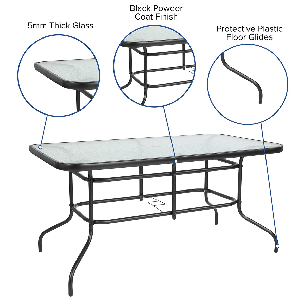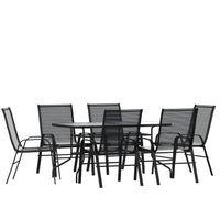 Have the beautiful patio or deck setting you've always wanted at your home or business with this modern outdoor patio dining set for 6. The sizable rectangular outdoor glass table has a designer rippled look, but is smooth to the touch to keep items level. The black metal base and frame provide a striking contrast to the glass top for an on-trend look. The overall design is enhanced by the ergonomic sling patio chairs that have breathable, black flex comfort material to keep you cool during the hot summer days and curved arms to relieve pressure from the upper body.Serve meals outside for a change of pace with no worries. This outdoor patio table boasts a solid steel, powder coated frame that will hold up to 130 Lbs. weight capacity and the outdoor patio chairs will hold up to 350 pounds to accommodate most users. The weather-resistant frames are designed to be enjoyed no matter the season. For longevity, care should be taken to protect from long periods of wet weather.Lightweight and stackable, the commercial grade patio chairs can be stacked up to 4 chairs high to store or clean your outdoor dining space. With plenty of space on this glass top patio table for everyone to have elbow room you'll get to take advantage of the outdoors more often while you enjoy time with friends and family.