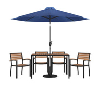 Flash Furniture Lark 7 Piece Outdoor Patio Dining Table Set - 4 Synthetic Teak Stackable Chairs with Arms - 30" x 48" Table - Navy Umbrella with Base