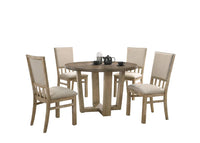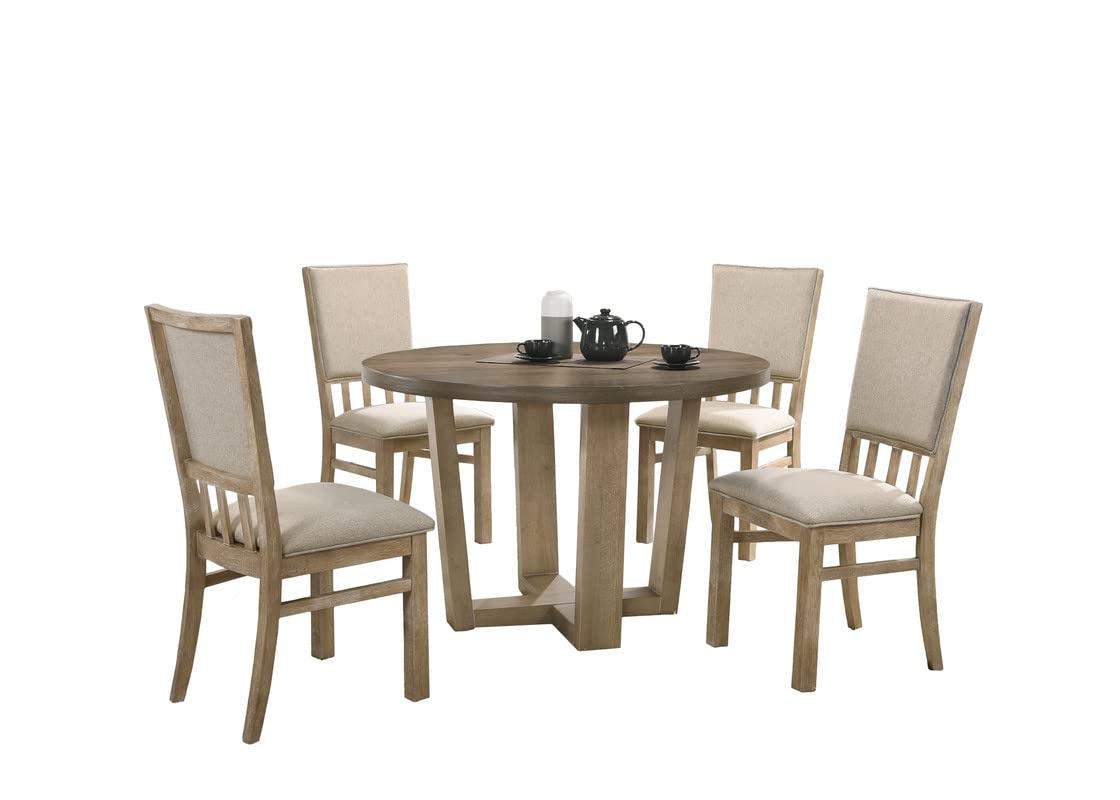 This dining set will help brighten the setting for any dining experience. With a 47-inch diameter tabletop and matching chairs, this round dining table is large enough for multiple sets of tableware, ornaments, and vases, allowing the whole family to dine together. The exquisite natural wood distressed pattern adds a touch of warmth and elegance to your home. The dining table features sturdy legs that not only provide stability but also allow for comfortable seating arrangements. The side chair seamlessly blends form and function, offering a comfortable seating experience. With its stylish and modern design, the set will transform any dining room or kitchen.