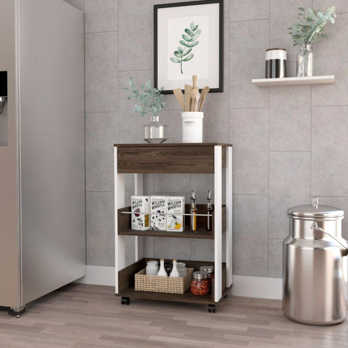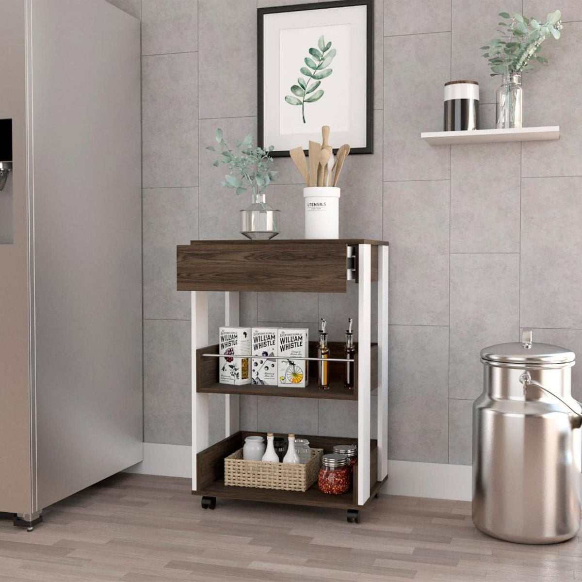 Pillar Kitchen Cart, don't be a kitchen wallflower! With the Pillar kitchen cart, you can spruce up your cooking area with a stylish, modern piece that offers extra storage and mobility. This handy cart has two large shelves (4,7"H X 20,0"W) to organize all of your essentials and a spacious drawer (5,5"H X 20,9"W) for even more organization. And the best part? The Pillar cart is easy to move around your kitchen, a superior-top size(22,5"W X 15,6"D) Designed with elegant white-dark walnut manufactured wood finish. Dimensions: Height: 34,88" Width: 22,5" Depth: 15,6" Furniture Type: Ready to assemble (full assembly required). Certifications: CARB phase II compliant – TSCA Title VI Compliant. Warranty: 1-year warranty coverage in wooden parts- 1-year warranty coverage in hardware pieces since its manufacturing date is found in the lot number printed in the product box.