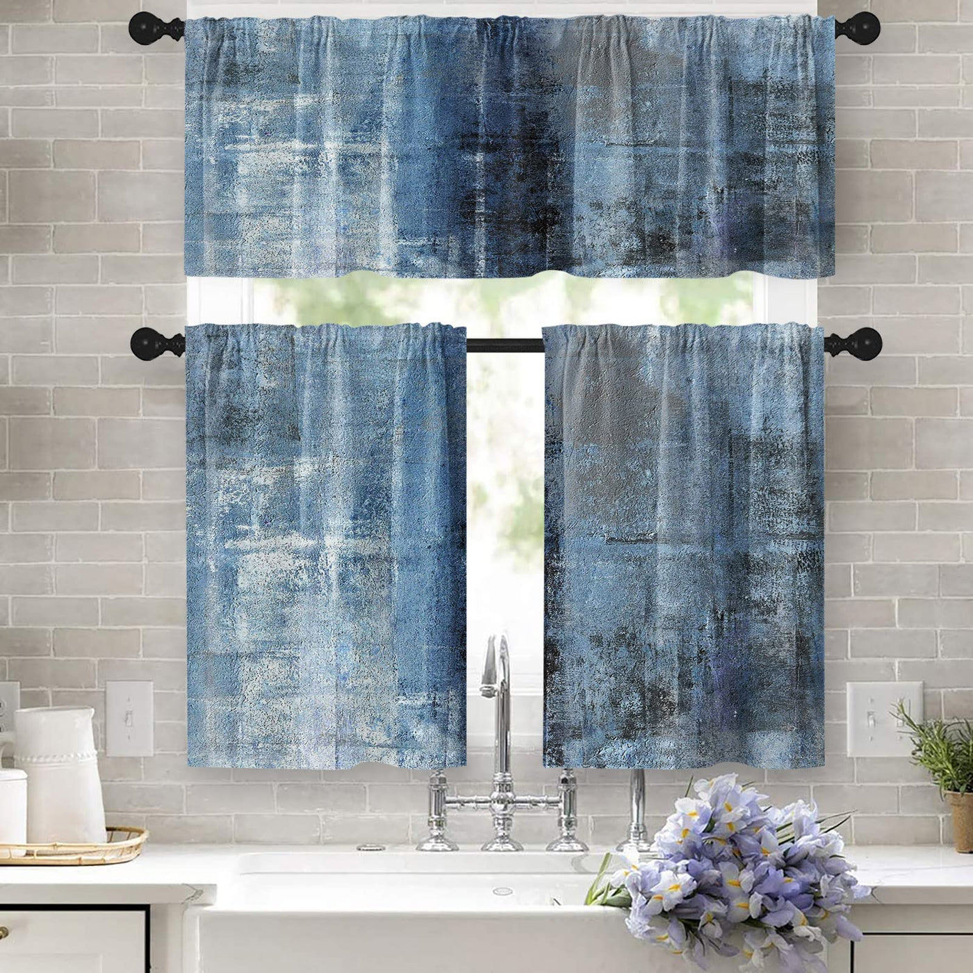 Tayney Blue Kitchen Curtains Grey Window Curtains Valance And Tier Set, Modern Rod Pocket Short Tier Curtain, Abstract Art Small