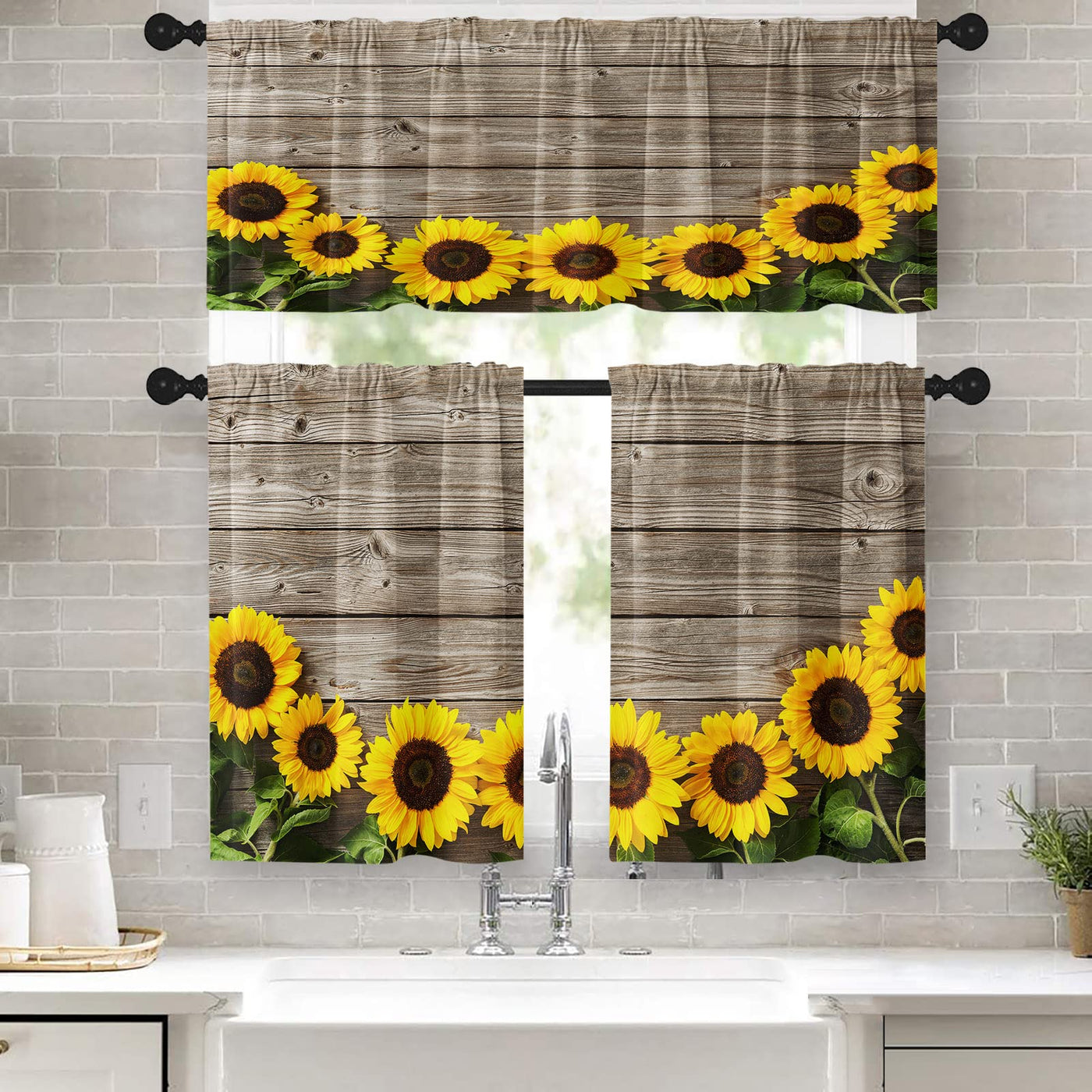 Tayney Sunflower Kitchen Curtains Wooden Board Window Curtains Valance And Tier Set 36 Inch, Yellow Flower Rod Pocket Short Tier
