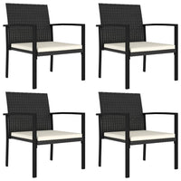 Add a touch of modern style with this patio dining chair set. It is designed to complete an patio dining set or stand out on its own. This chair set makes an eye-catching statement in any setting. Sturdy steel frame wrapped with weather-resistant PE rattan, the dining chairs are stable, durable and suitable for outdoor use. The included seat cushions also provide additional seating comfort. Thanks to the lightweight construction, the outdoor chairs are easy to move around.Color: BlackCushion color: CreamMaterial: Poly rattan, powder-coated steelCushion material: Fabric (100% polyester)Chair dimensions: 20.9 x 23 x 32.7 (W x D x H)Seat size: 18.5/16.1 x 17.7 (W x D)Seat height from the ground: 16.5Armrest height from the ground: 24Seat Cushion thickness: 2Delivery contains:4 x Dining chair4 x Seat cushionMax. loading capacity: 242.5 lbWARNING Cushion and pad are only for outdoor use. Do not take them inside of dwellingCalifornia Proposition 65Warning: Cancer and Reproductive Harm – www.P65Warnings.ca.gov.
