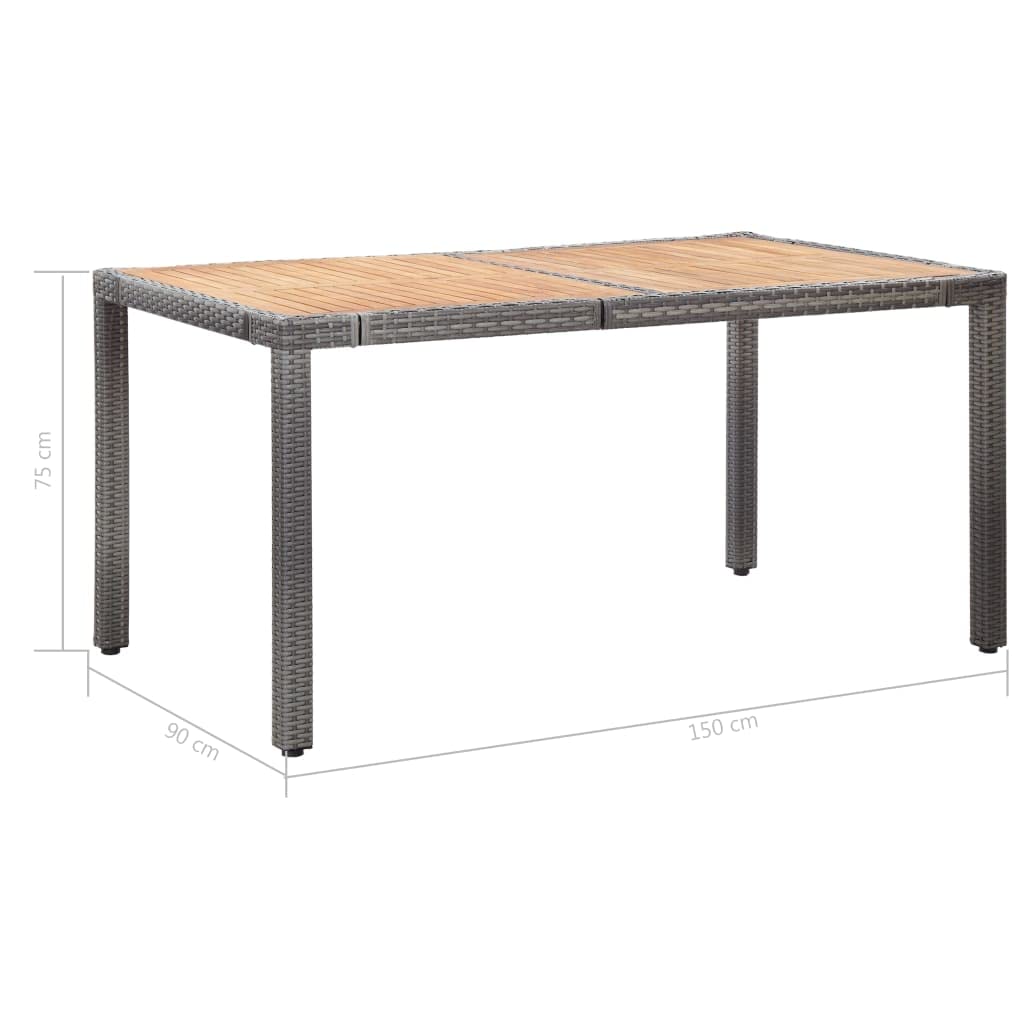 Note: We recommend covering the set during rain, snow and frost for its best service to last. Color: Gray and dark Gray Material: PE rattan, solid acacia wood, powder-coated steel Cushion cover material: 100% polyester Table dimensions: 59.1" x 35.4" x 29.5" (L x W x H) Chair dimensions: 22.8" x 24" x 34.6" (W x D x H) Seat width: 18.5" Seat depth: 16.9" Seat height from the ground without cushion: 16.5" Armrest height from the ground: 25.6" Assembly required: Yes Delivery contains: 1 x Table 6 x Chair 6 x Seat cushion WARNING Cushion and pad are only for outdoor use. Do not take them inside of dwelling