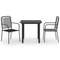 This table is made of sturdy powder-coated steel, which is stable and durable. The black silk printing tabletop is easy to wipe clean. The chair is made of cotton rope, woven over a powder-coated steel frame. It is resistant to UV rays and offers a high level of comfort and relaxation!