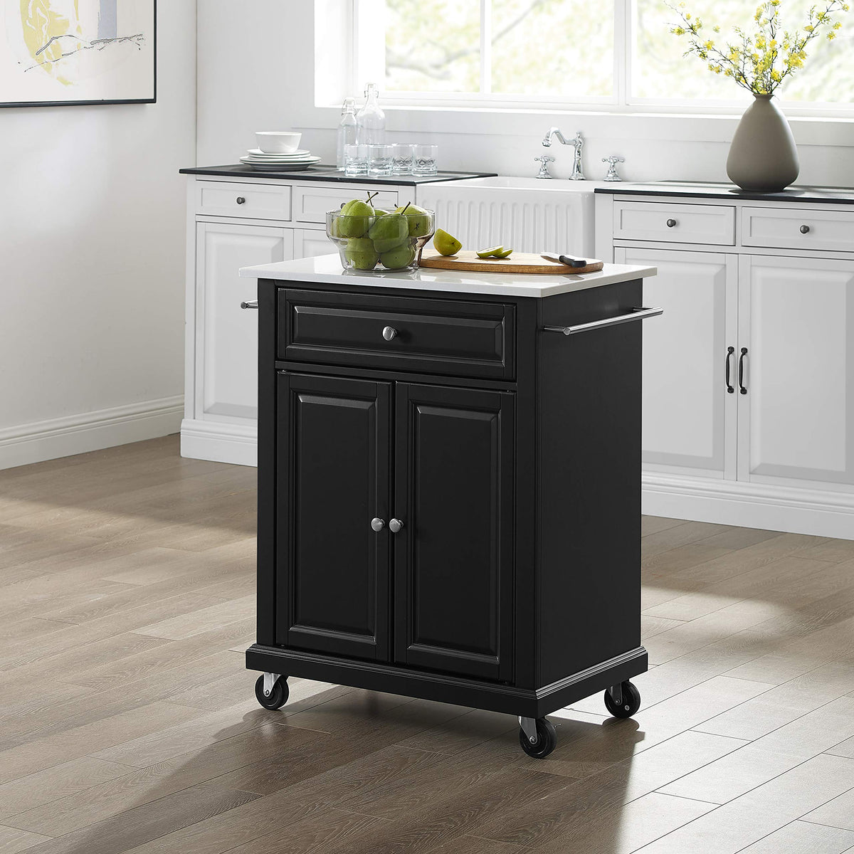 DescriptionSave space while adding mobile storage with the Compact Kitchen Cart. Featuring a large cabinet with an adjustable shelf, this cart easily stores pots, pans, or small appliances. Two towel bars and a full-extension drawer are perfect for keeping dishtowels and utensils close at hand. With a beautiful stainless steel countertop, plus heavy-duty casters for mobility, the Compact Kitchen Cart is a welcome addition to your kitchen space.