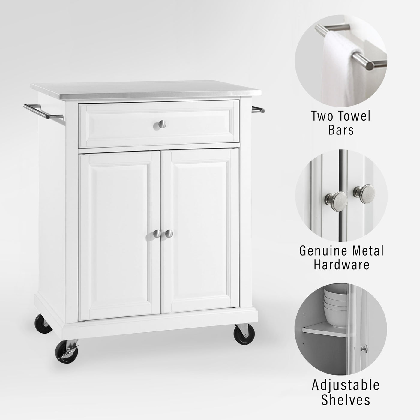 Save space while adding mobile storage with the Compact Kitchen Cart. Featuring a large cabinet with an adjustable shelf, this cart easily stores pots, pans, or small appliances. Two towel bars and a full-extension drawer are perfect for keeping dishtowels and utensils close at hand. With a beautiful stainless steel countertop, plus heavy-duty casters for mobility, the Compact Kitchen Cart is a welcome addition to your kitchen space.