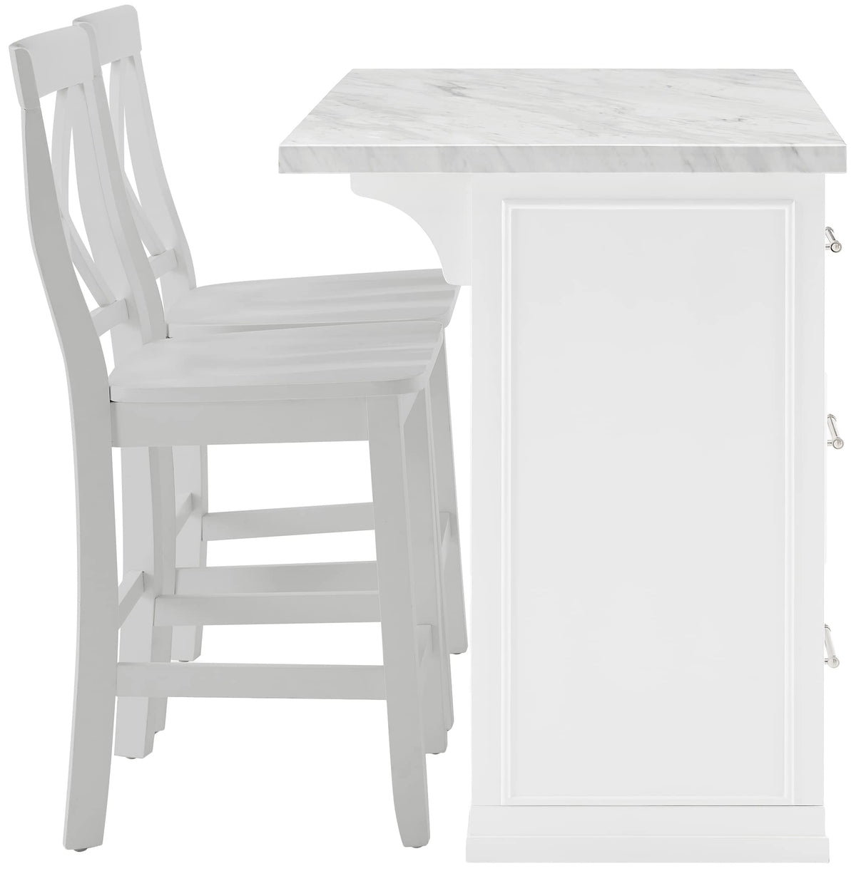 The kitchen is often referred to as "the heart of the home." It's where we cook, where we eat, and where we celebrate. The Cutler Kitchen Island with X-back stools provides the space for all those things while looking fabulous in the process. Featuring an elegant faux marble countertop and beautiful beaded molding, this kitchen island with storage is a showstopper. Four large storage drawers plus a sizable cabinet will keep all your cooking essentials organized, while the expanded counter provides an island table for the kitchen. Just tuck the x-back counter stools under the island's overhang and you will be ready to entertain in your family's favorite room.