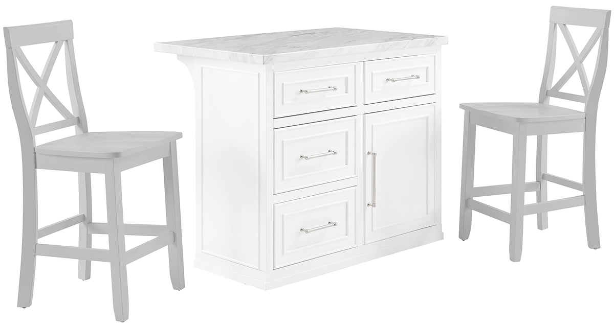 Crosley Furniture Cutler Kitchen Island with Faux Marble Top and X-Back Stools, White/Gray