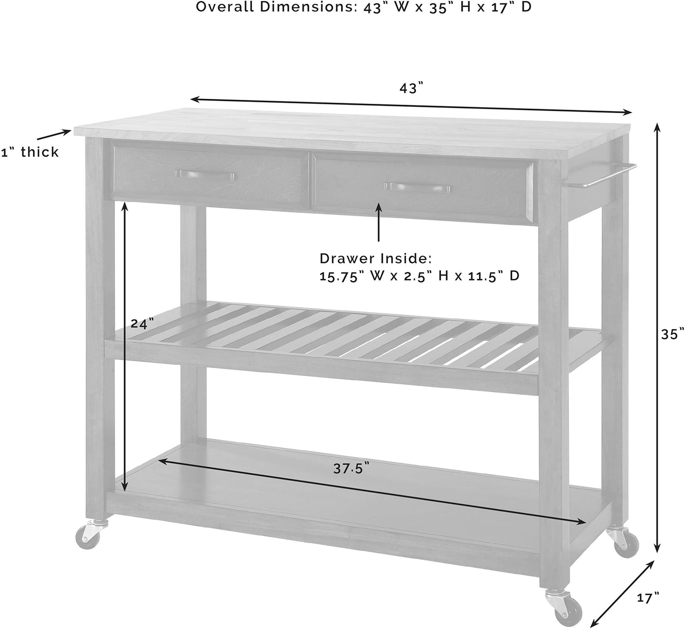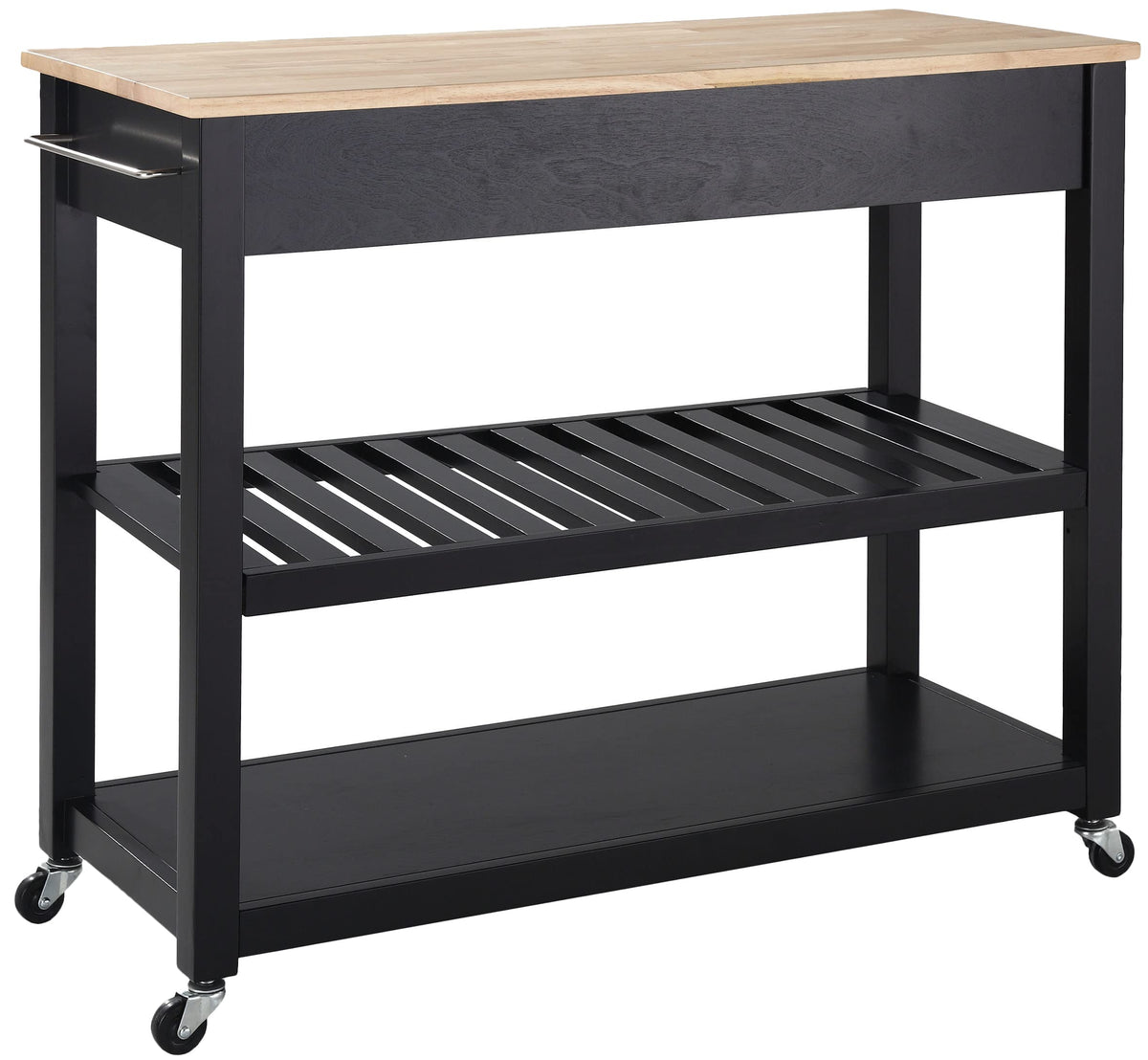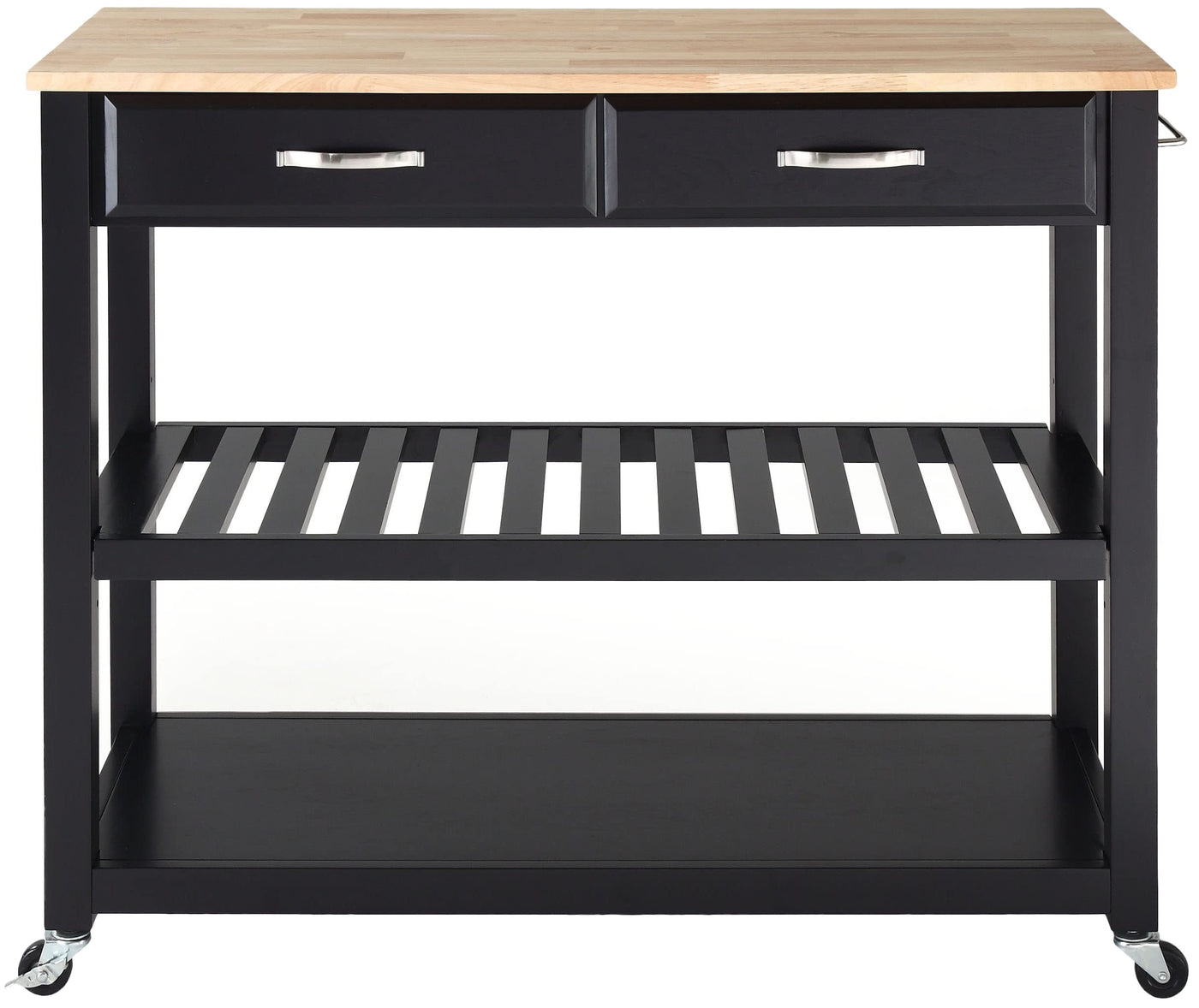 Mobility and open storage are the hallmarks of the Kitchen Prep Cart. Featuring a sturdy wood countertop and two deep storage drawers, this cart keeps utensils close at hand while providing ample space for food prep. The slatted center shelf provides storage for wine bottles and can be removed to create space for larger kitchen items. With four casters, this cart can adapt to the changing needs of your kitchen. Simple and stylish, the Kitchen Prep Cart is an ideal solution for your every day kitchen needs.