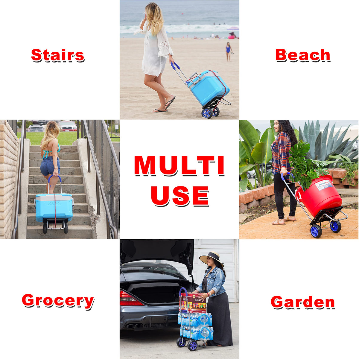 The Bigger Mighty Max personal Dolly, folds in 1/2 for compact storage. It is equipped with a bigger toe plate to help transport larger items wih ease. It has a comfort cushion handle that allows you to pull it anywhere. The oversized beefy wheels allow for smooth rolling on any surface, including cobblestones, sand, stairs or any uneven surfaces.