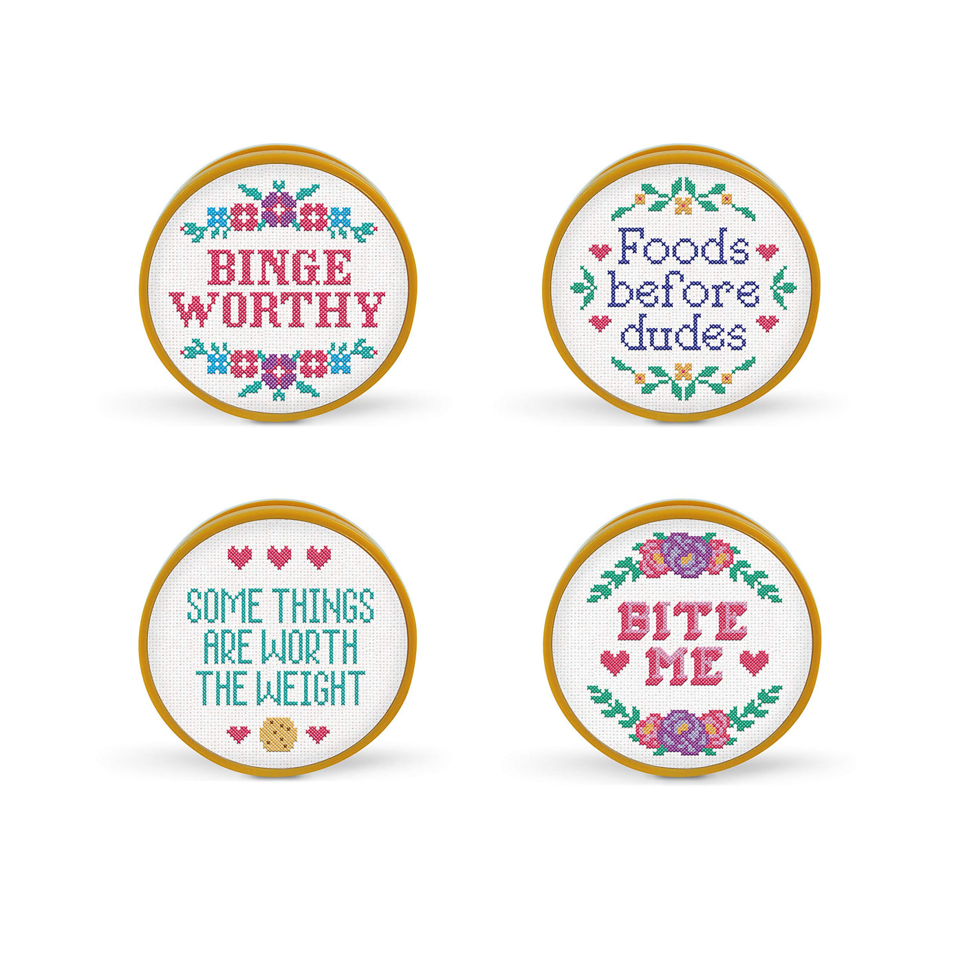 Freds In Stitches Bag Clips Are For The Subversive Snackers That Like A Little Stitchin' In Their Kitchen. Go Ahead And Treat Yoself, Then Save For Later With These Cheeky Cross-Stitch-Inspired Designs! 4 Designs On Each Colorful Backer Card, Each Clip Measures 2.4' In Diameter And Is Constructed From Durable Abs Plastic.
