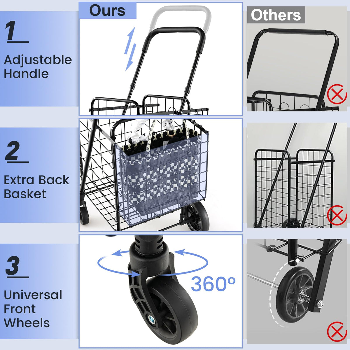 Goplus Folding Shopping Utility Cart, Double Basket And 360° Swivel Wheels, Adjustable Handle, Small Cart Perfect For Grocery Laundry Book Luggage Travel