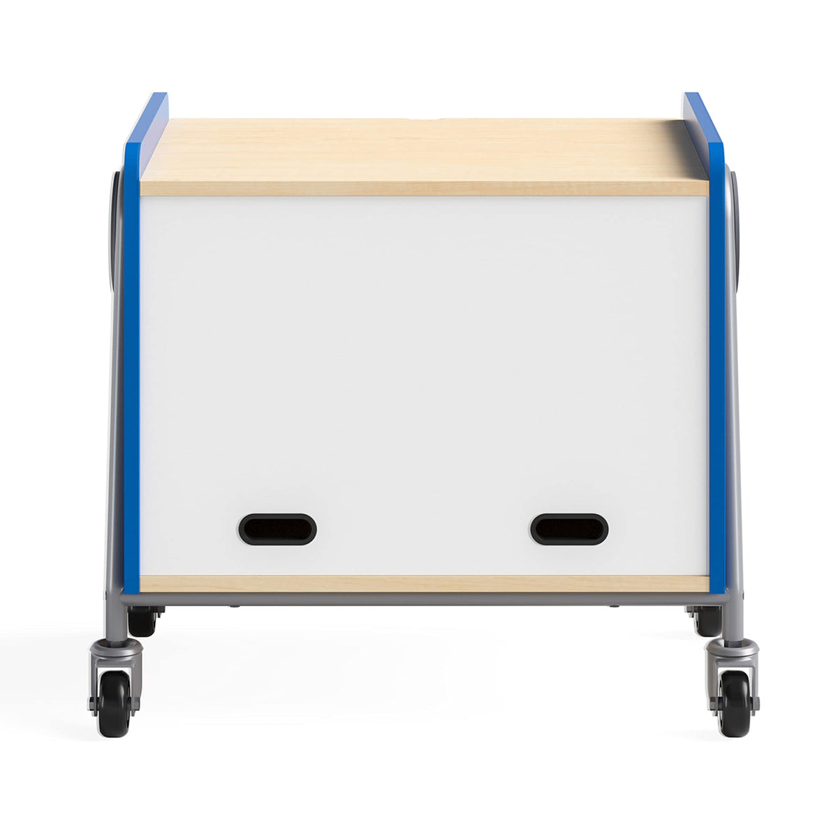 The complete mobile storage & office organization collection is here with Whiffle rolling storage solutions. This double-column office rolling cart features 4 removable 3" tall tote drawers and 2 open shelving cubbies tucked away behind a door so your supplies can be out of sight, yet always at-the-ready. The top surface is made of High Pressure Laminate (HPL) for a tough, durable work surface. The rest of the structure is constructed with Thermal-Fused Laminate (TFL), ensuring that this handy cart stands up to the tests of time.Use as a printer stand, work surface, file cabinets for home office for, shelves for storage or under desk storage, around the classroom, for business presentations, your makers room and anything else your mind can imagine. Available in 5 fun colors!