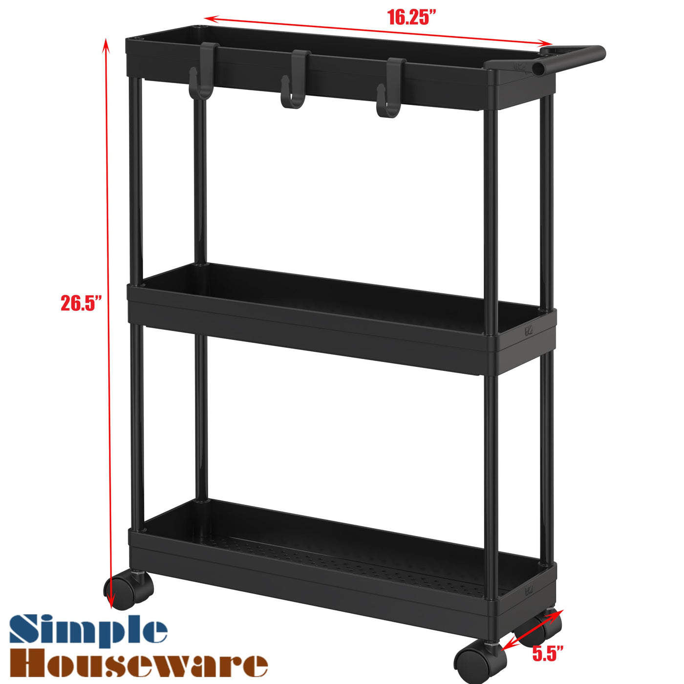 Simple Houseware 3-Tier Slim/Super Narrow Kitchen Cart with Handle, hooks and storage with shelves , Black