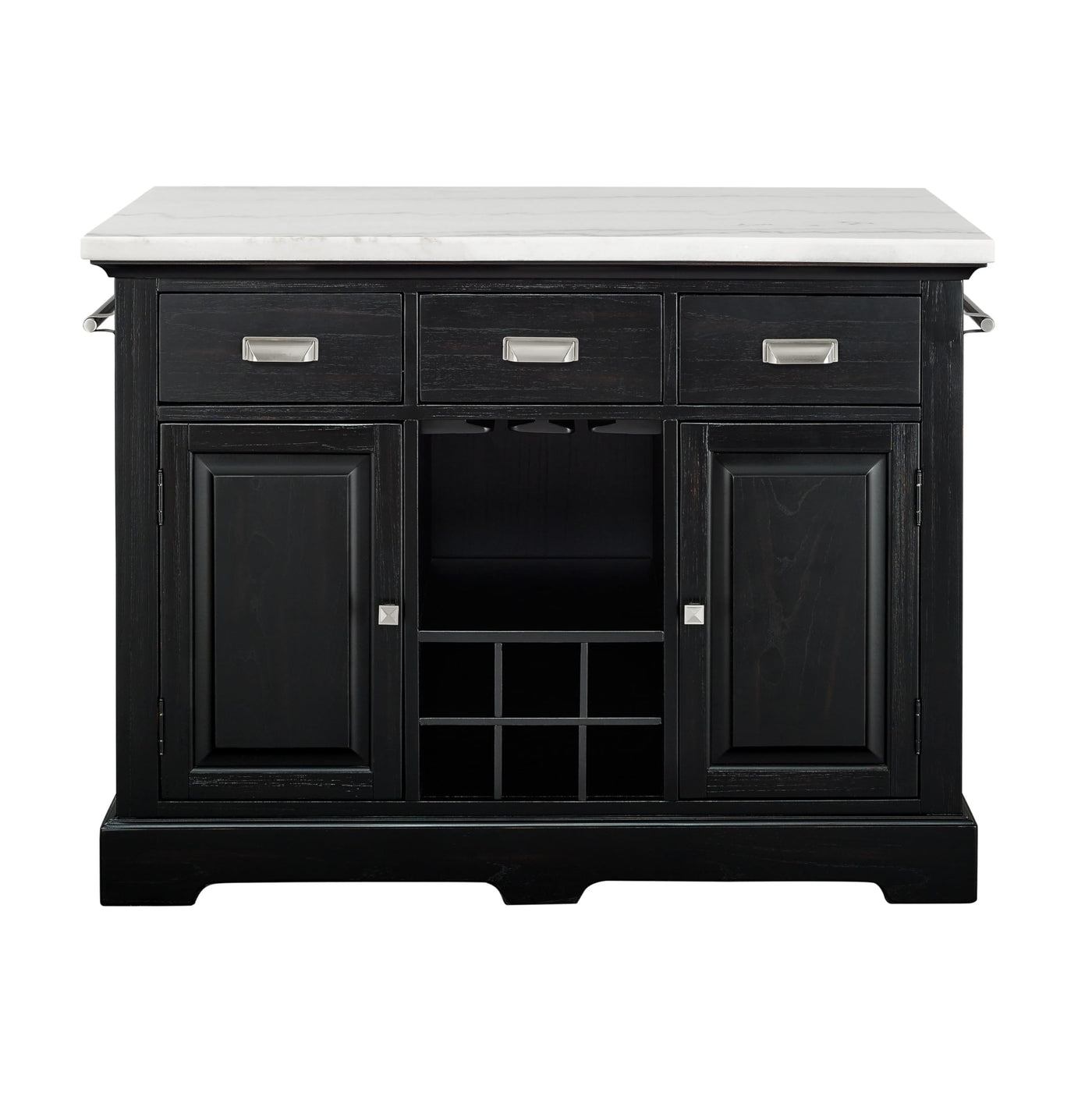 The Aspen Kitchen Island is sure to be your hub for all kitchen activity with its vintage styling and modern edge. Features abound with a luxurious marble top, storage drawers, cabinets, wine rack, stemware storage and more! The pewter cup hardware and towel rack accent the ebony wood finish for a piece that will add beauty and function to your home for years to come.
