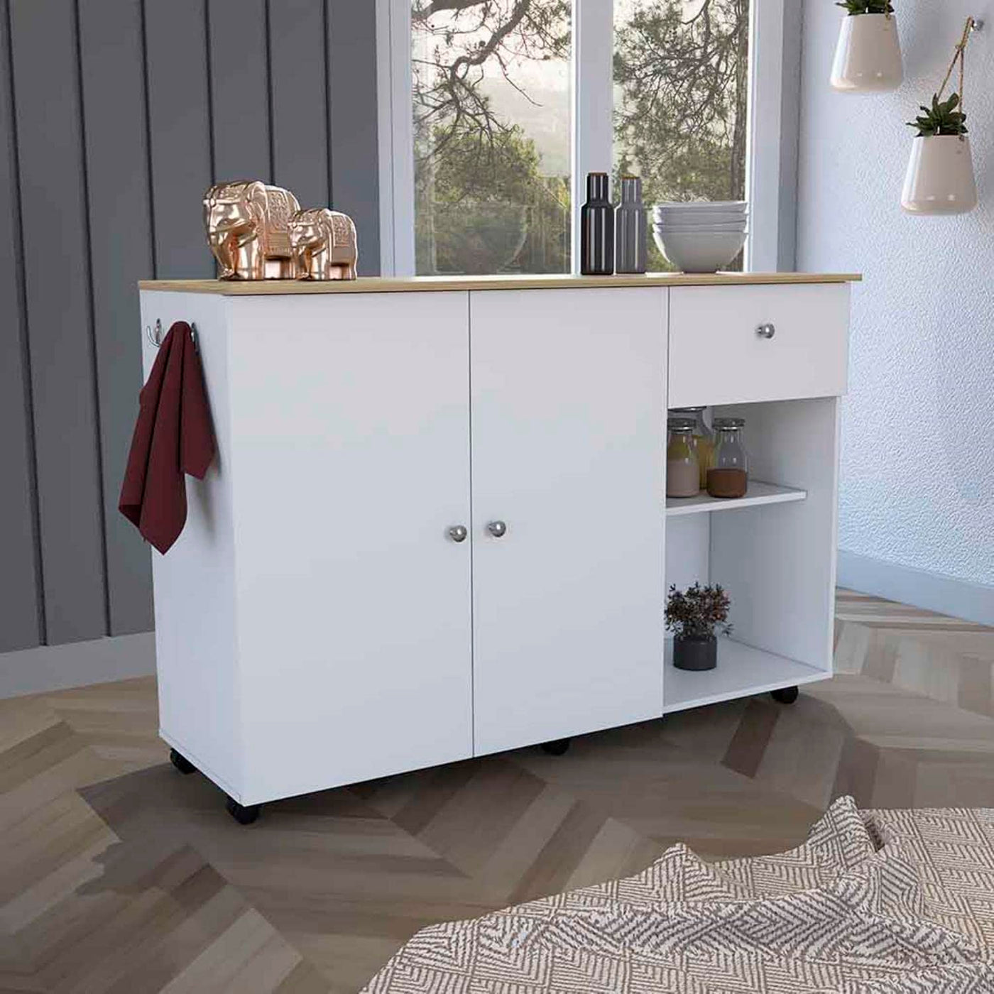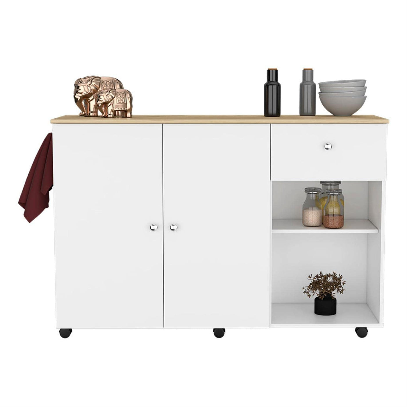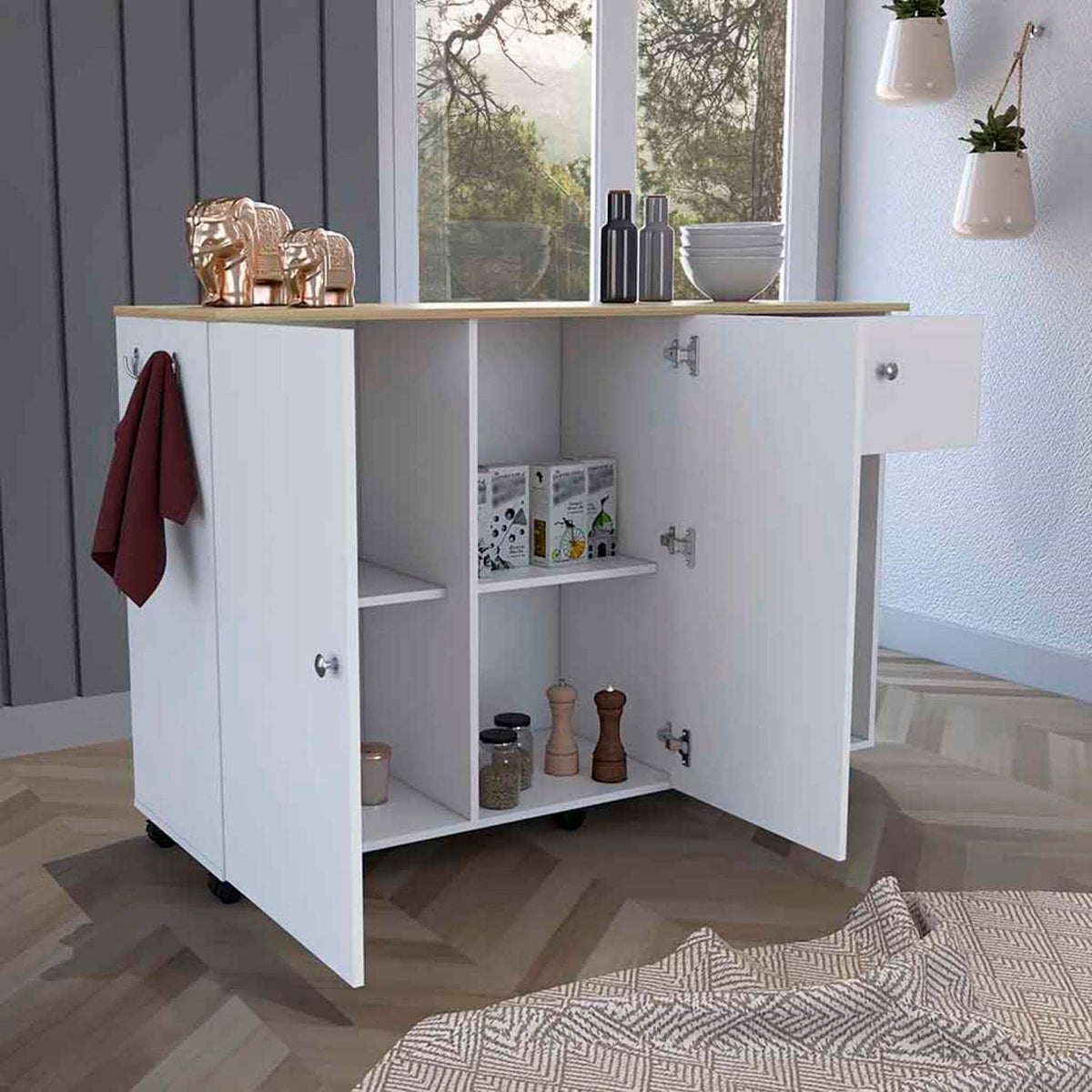 Syros Kitchen Island Cart, 6 Carter, 1 Drawer, Double Door Cabinet, 2 External Shelves, 4 Interior Shelves, White/Pine