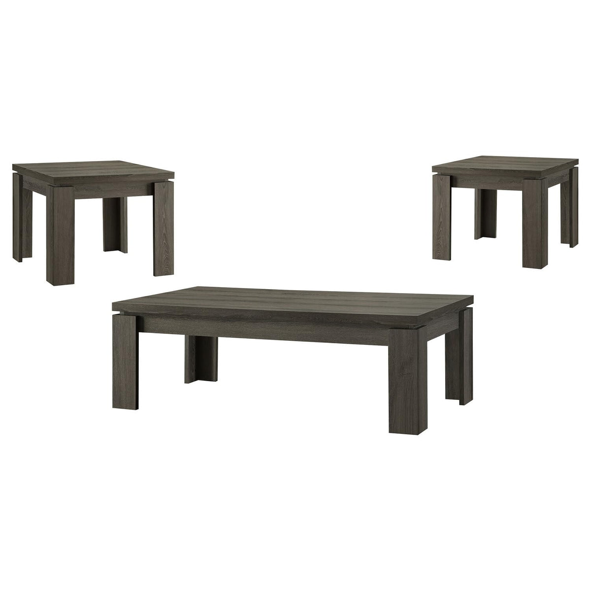 This three-piece table set adds an edge of modern sophistication to any home. Complete with one coffee table and two end tables, this set balances out a room with contemporary, no-nonsense appeal. A weathered gray finish gives it an understated touch of panache. Floating table tops are sturdy and strong, providing three convenient surfaces for books, drinks, picture frames, and more. Whether you prefer an intricately decorated home or a more minimal aesthetic, the strong yet simple silhouette of this set blends seamlessly with most any decor.