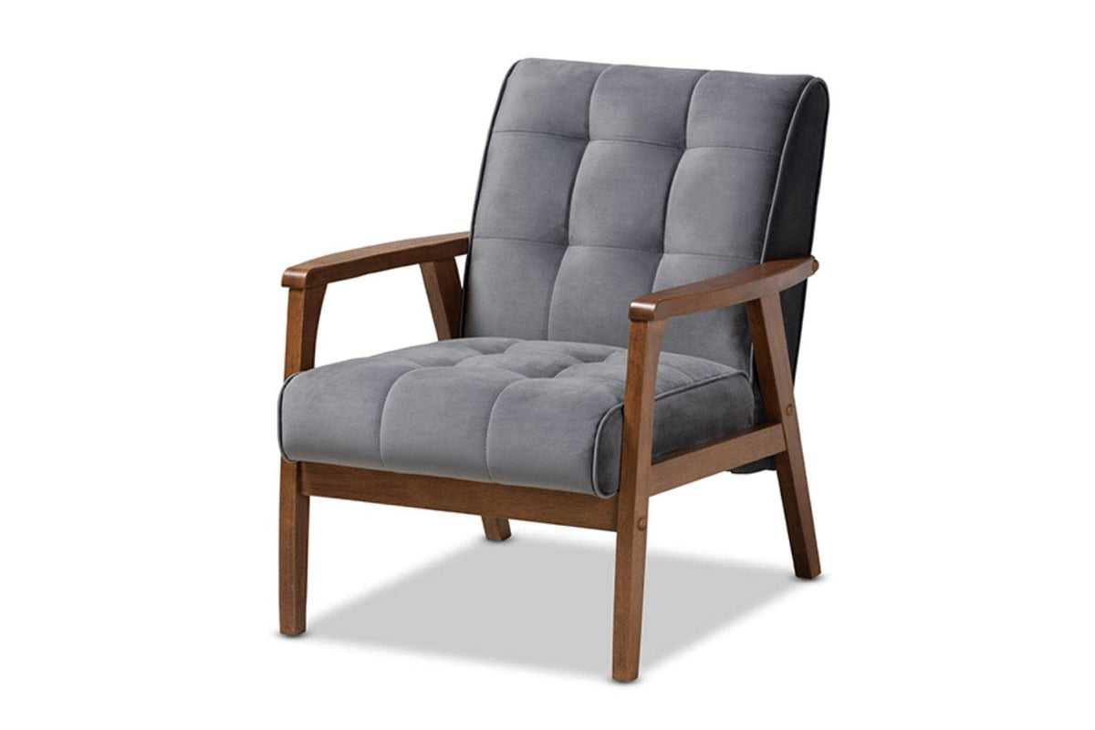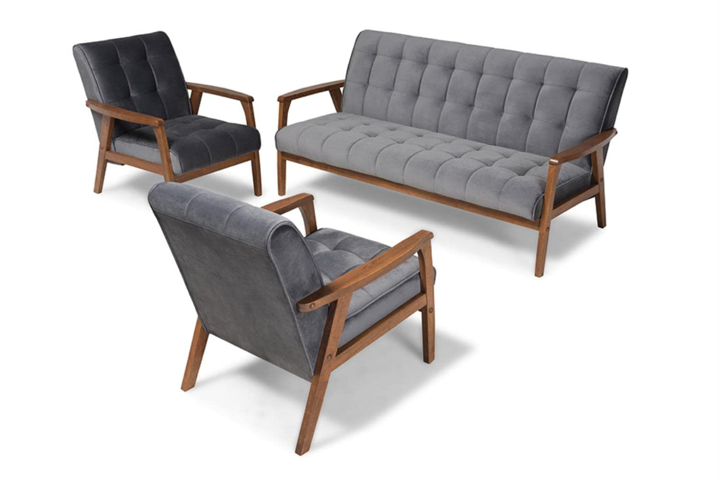 Baxton Studio Asta Mid-Century Modern Grey Velvet Fabric Upholstered Walnut Finished Wood 3-Piece Living Room Set