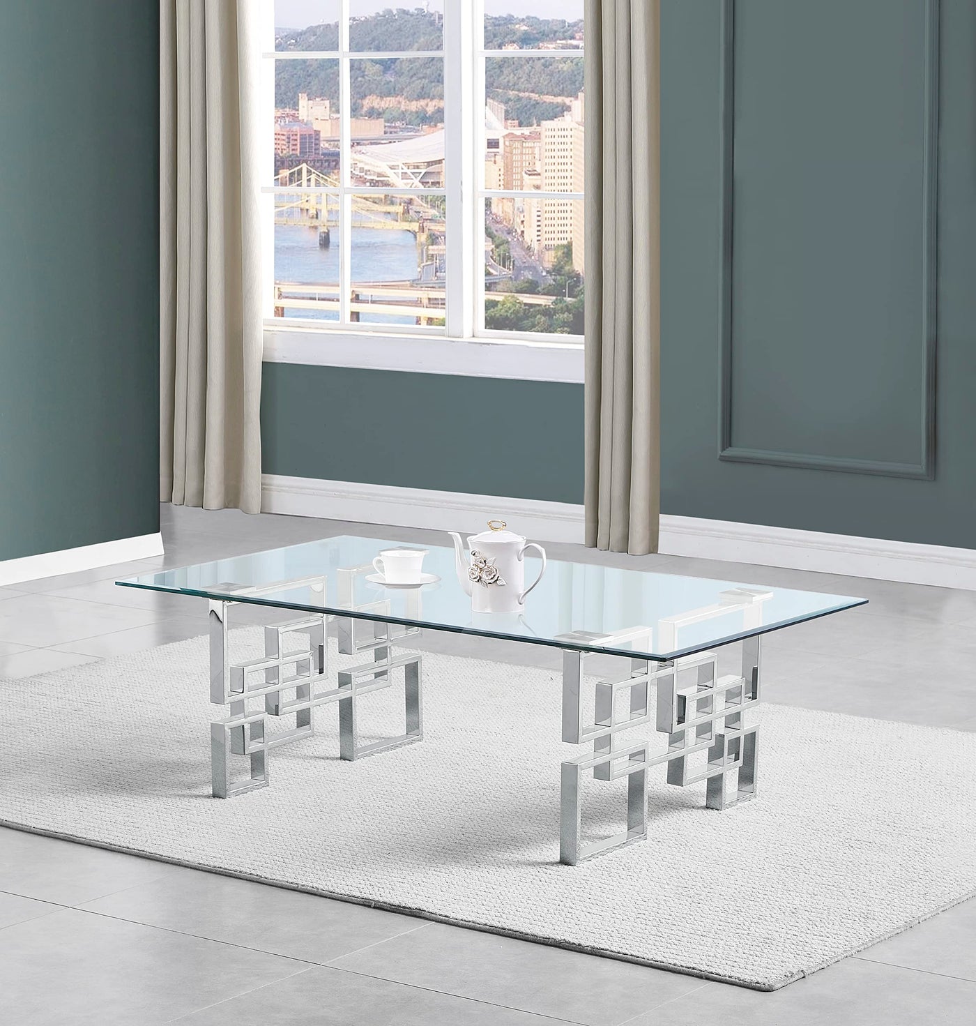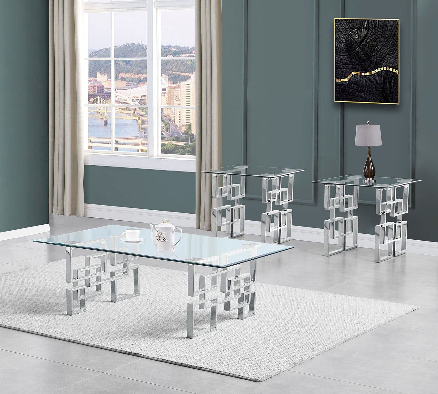 Tempered Glass Table Top | Unique Silver Stainless Steel Base | Set includes (1) Coffee Table and (2) End Tables