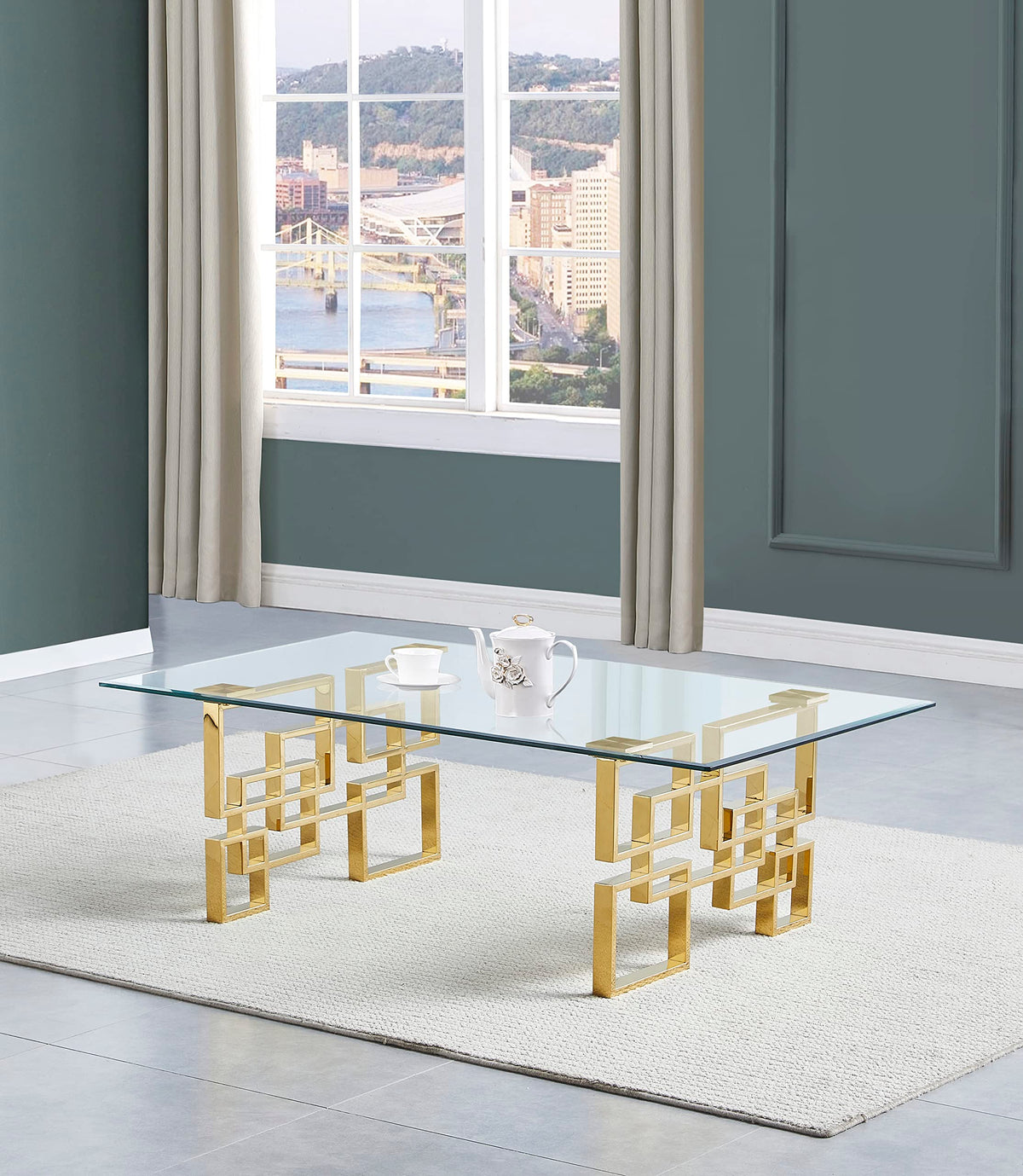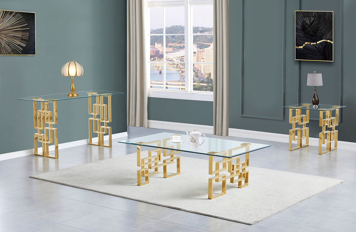 Tempered Glass Table Top | Unique Gold Stainless Steel Base | Set includes (1) Coffee Table, (1) End Tables, and (1) Console Table