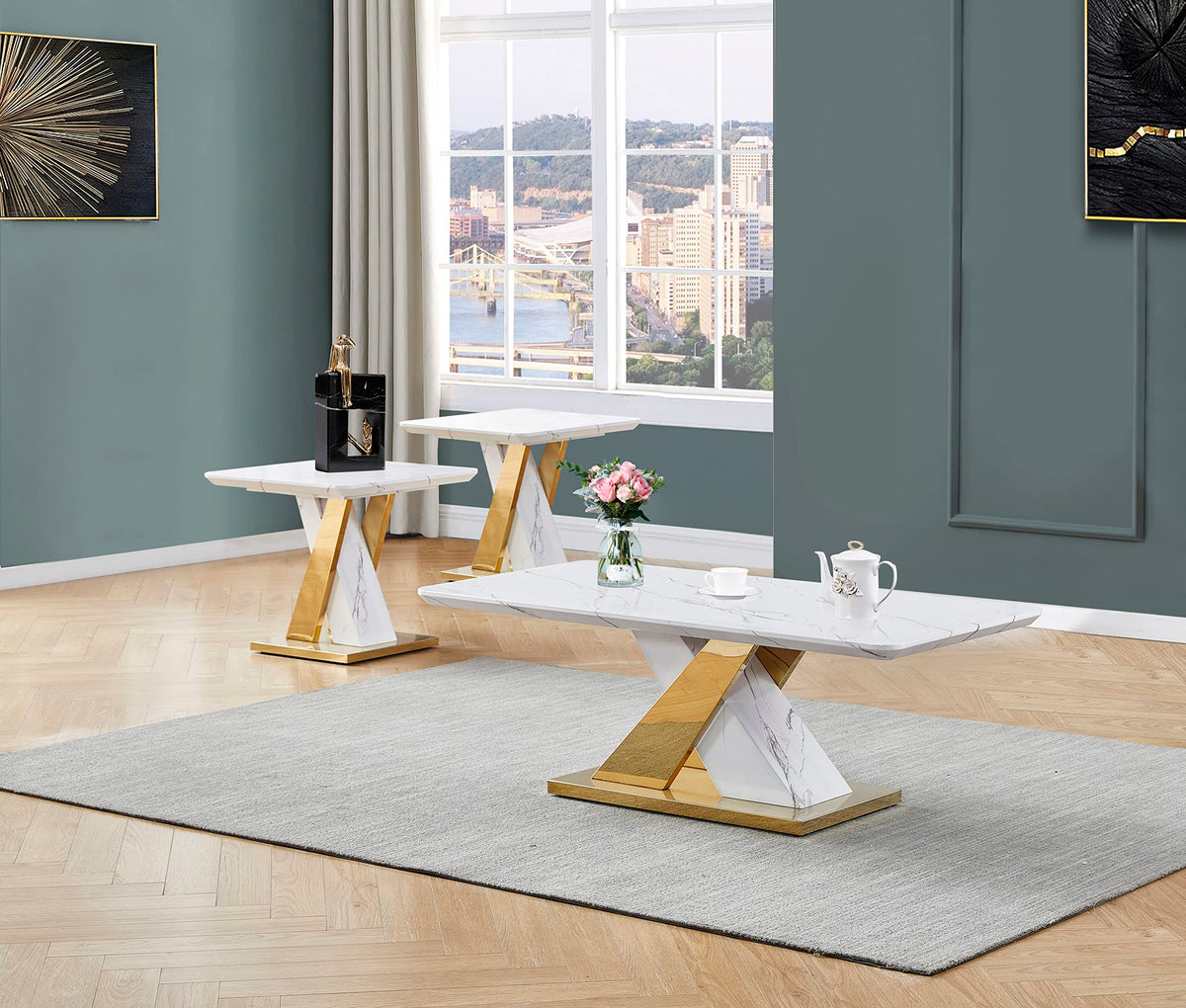 White Faux Marble Table Top | Gold Color Stainless Steel Base | Set includes (1) Coffee Table and (2) End Tables