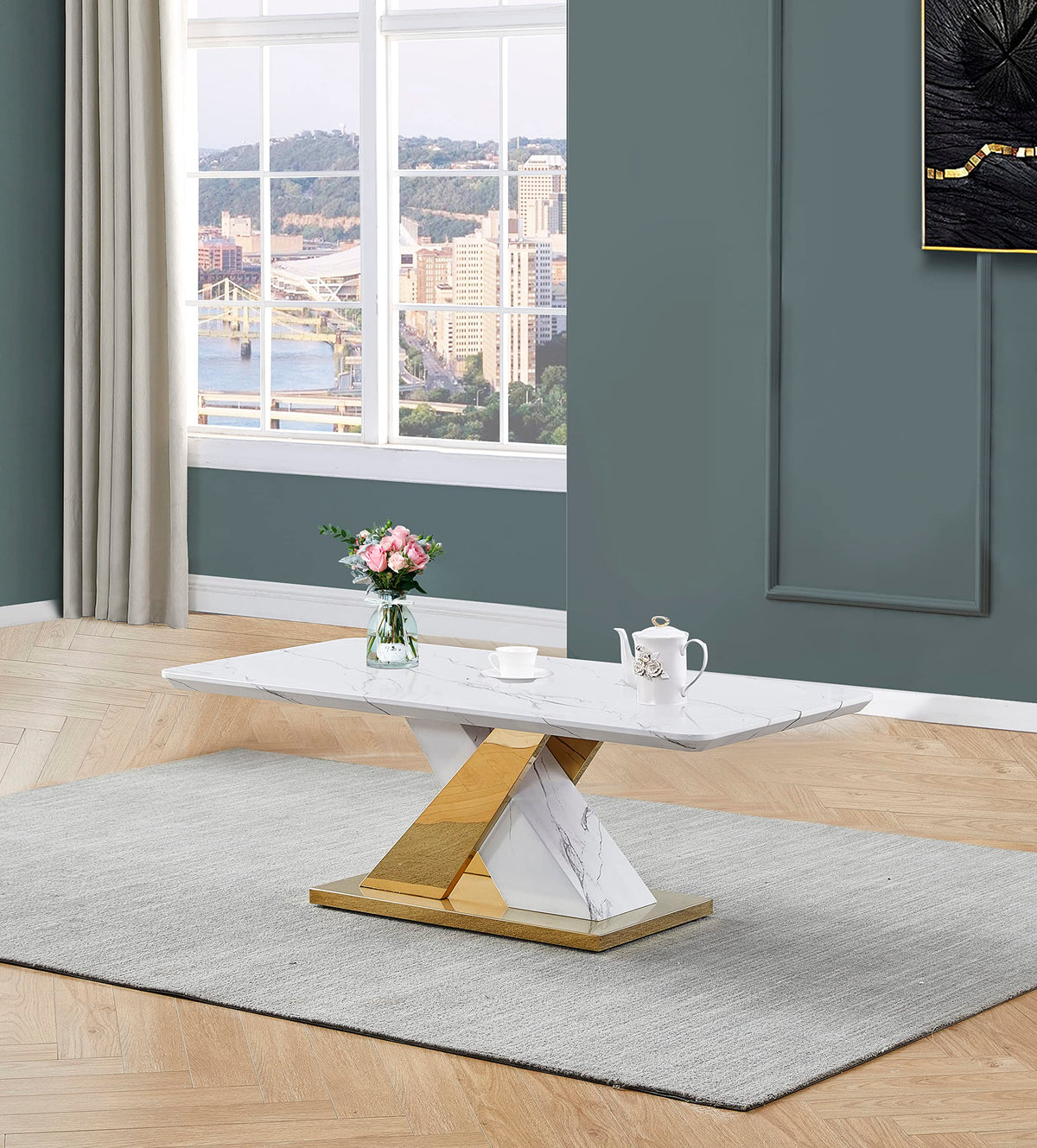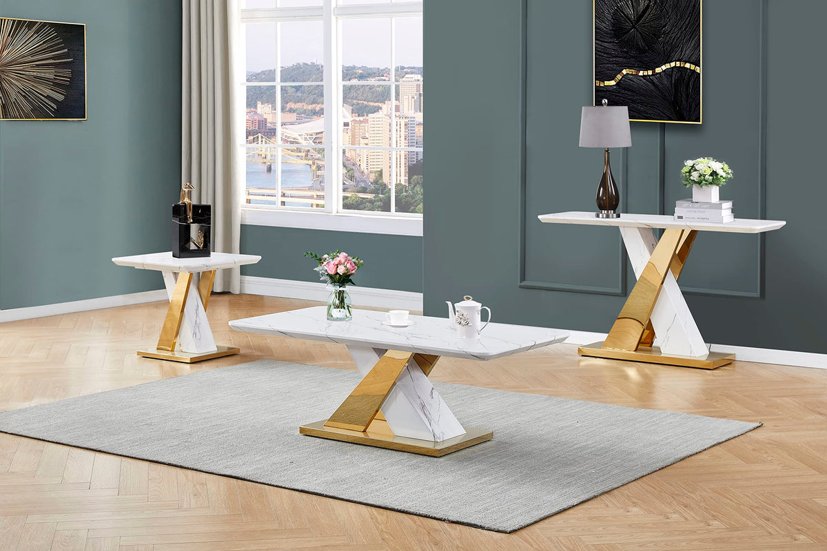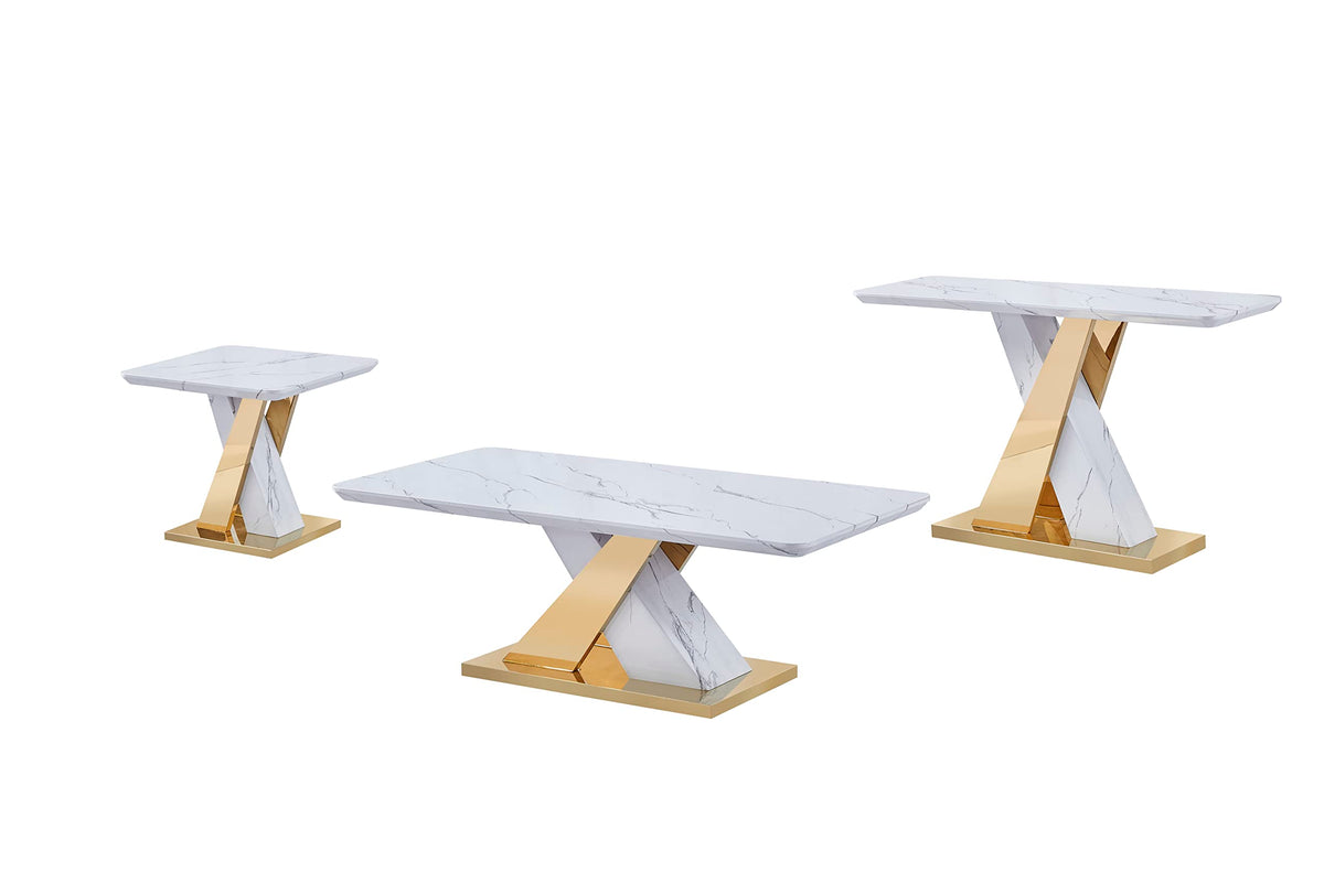 White Faux Marble Table Top | Gold Color Stainless Steel Base | Set includes (1) Coffee Table, (1) End Tables, and (1) Console Table