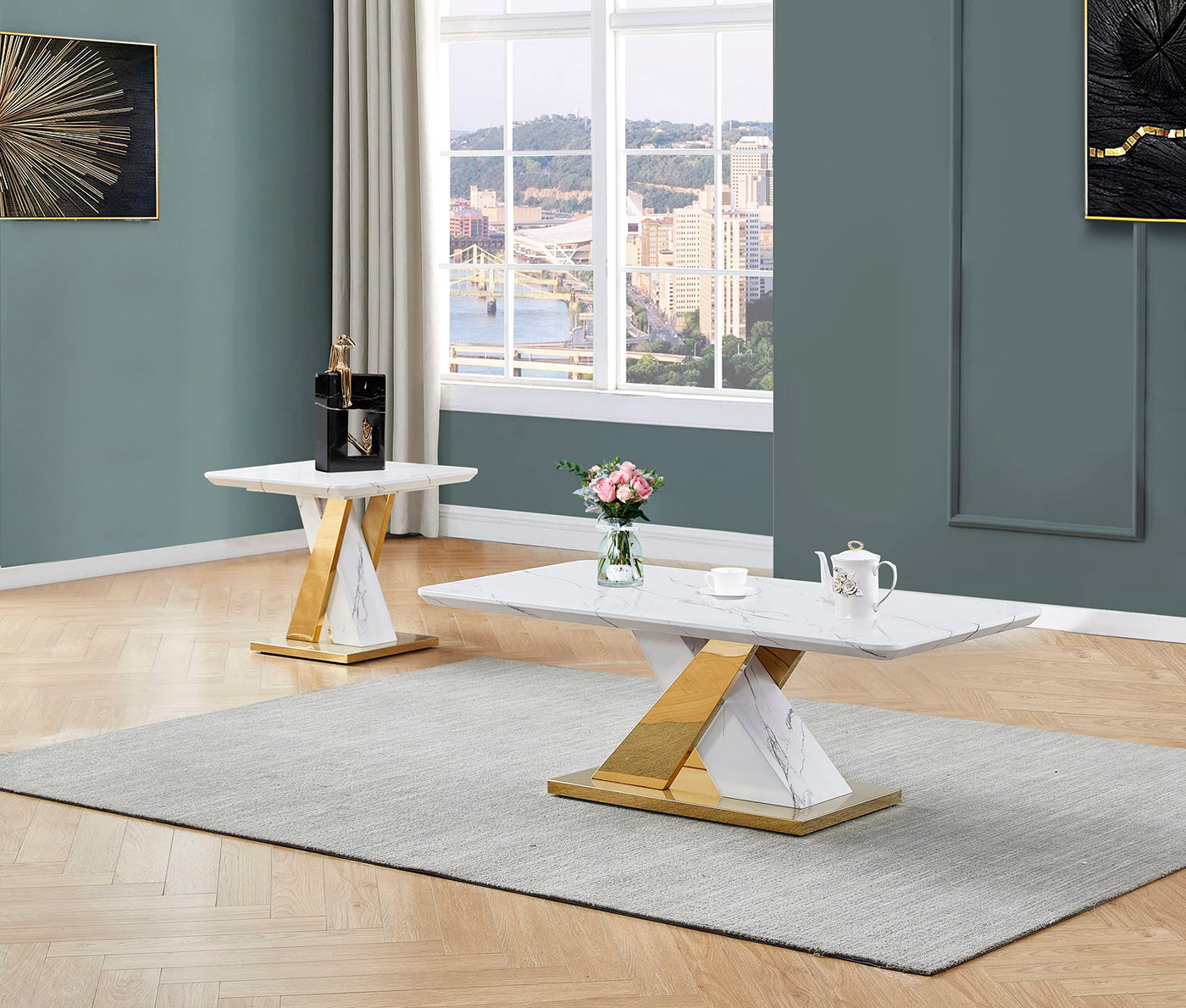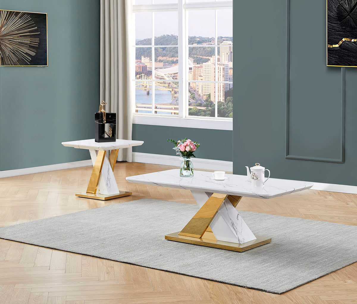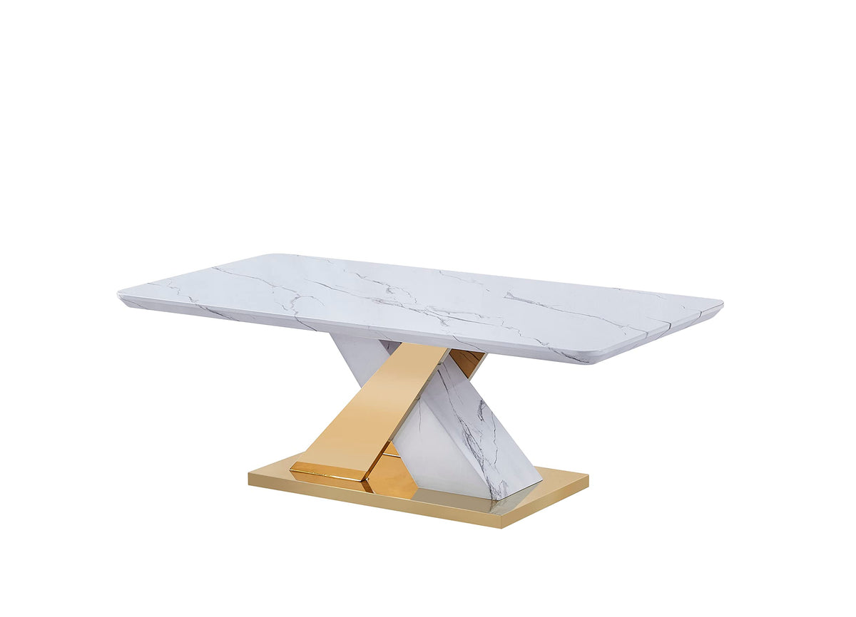 White Faux Marble Table Top | Gold Color Stainless Steel Base | Set includes (1) Coffee Table and (1) End Tables