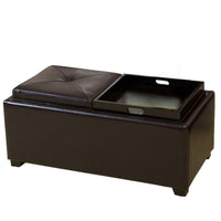 The kenwell is a convenient piece for your serving and storage needs. Upholstered with rich bonded leather, this ottoman has a double sided top that can be flipped to reveal two separate trays. The trays are constructed from sturdy hardwood to place and serve dishes or beverages. With this ottoman, you also get a storage compartment to keep your home clutter free. Dimensions: 38'' L x 19'' W x 17'' H.