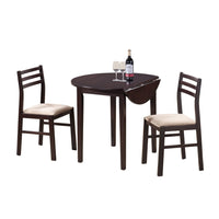 This casual three piece dining set offers a classic styling that will blend in with any decor. This rounded table features a solid-top drop leaf, straight edges and sleek square legs. The armless side chairs feature a ladder back design with padded upholstered.