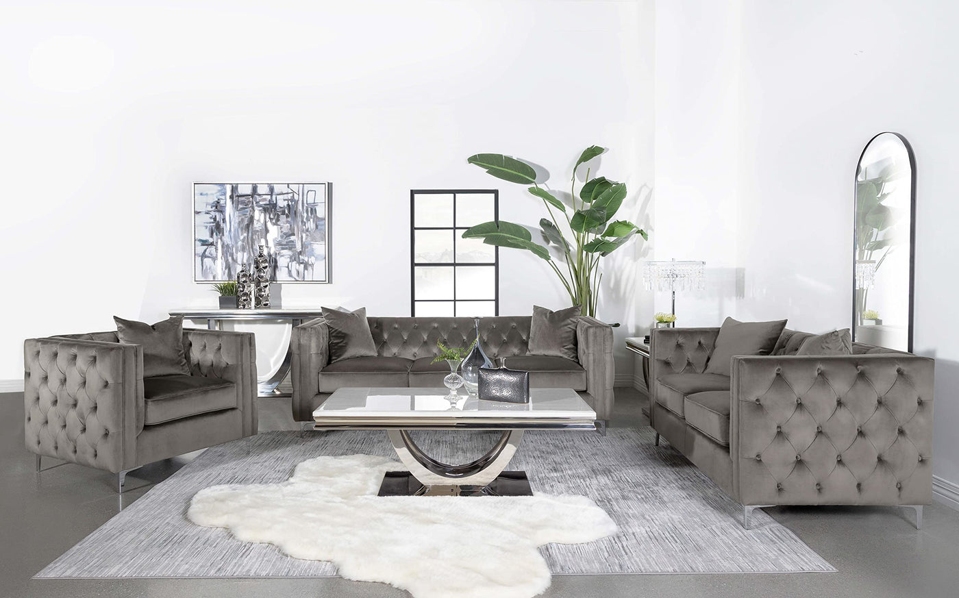 Set includes: One (1) sofa, one (1) loveseat and one (1) chair | Tuxedo style frames lend a timeless retro-inspired expression | A soft urban bronze velvet offers a plush look and feel and neutral color tone | Tight button-tufted backrests and arms create a supportive, welcoming embrace | Sturdy metal bracket legs offer a subtle lift and elevation over flooring | Matching throw pillows create extra comfort and tie the look together | Sofa: 85.25"W x 33.75"D x 30.00"H | Loveseat: 62.50"W x 33.75"D x 30.00"H | Chair: 39.00"W x 33.75"D x 30.00"H