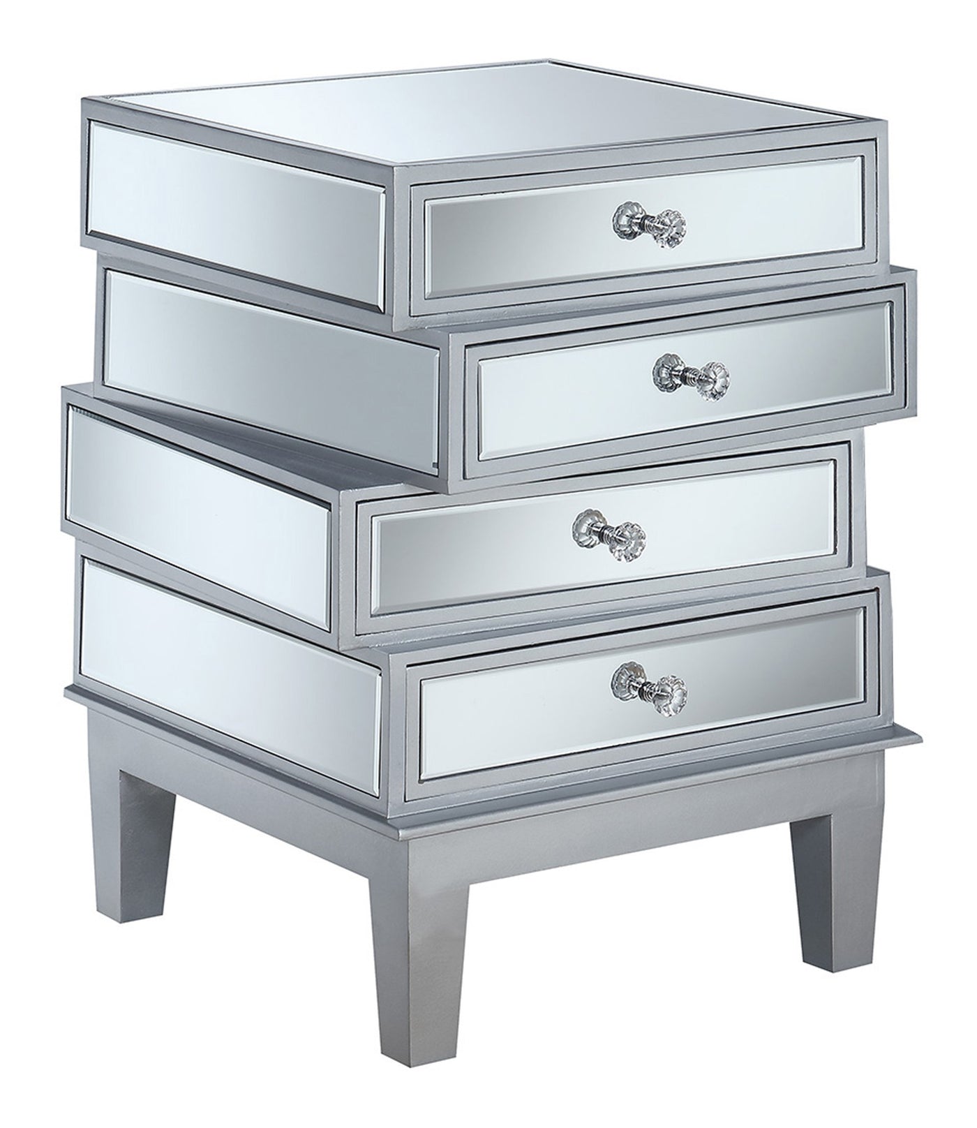 Bring a touch of elegance and glam to your home with the gold coast J Daniels end table by convenience concepts Featuring 4 drawers that allow plenty of space to hide away unsightly accessories remote controls or magazines Mirrored glass panels paired with faux crystal rosette drawer knobs really pull this piece together The staggered effect give this piece a unique yet classy contemporary design Look for other items from the gold coast collection from convenience concepts