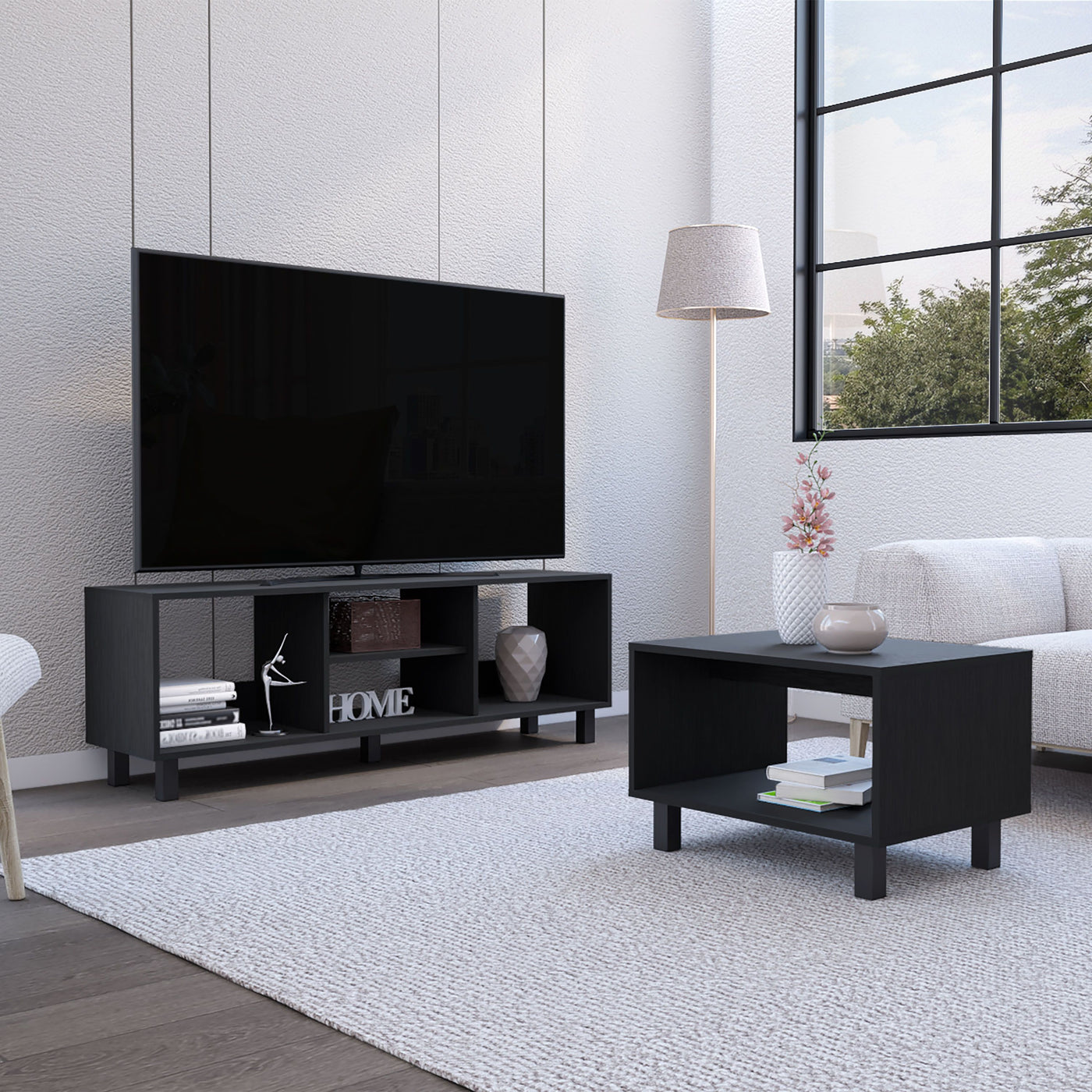 Transform your living space with the Carter 2 Piece Living Room Set, a perfect harmony of style and function. This set features a TV Rack and Coffee Table in a sophisticated black manufactured wood finish. The TV Rack is designed with open storage (two side shelves 17.5"W x 13.5"H and two central shelves 6.4"H x 17.5"W), offering ample space for your entertainment needs on a generous top surface (55.2"W x 13.7"D). The Coffee Table complements the look with its open shelf (10.6"H x 22.3"W) and a spacious top (23.3"W x 17.7"D). Both pieces rest on sturdy steel legs, bringing your home a modern, industrial vibe. Dimensions: Height: 18,7/15,7” Width: 55,2/23,6” Depth: 13,7/17,7” Furniture Type: Ready to assemble (full assembly required). Certifications: CARB phase II compliant – TSCA Title VI Compliant. Warranty: 1-year warranty coverage in wooden parts- 1-year warranty coverage in hardware pieces since its manufacturing date found in the lot number printed in the product box.